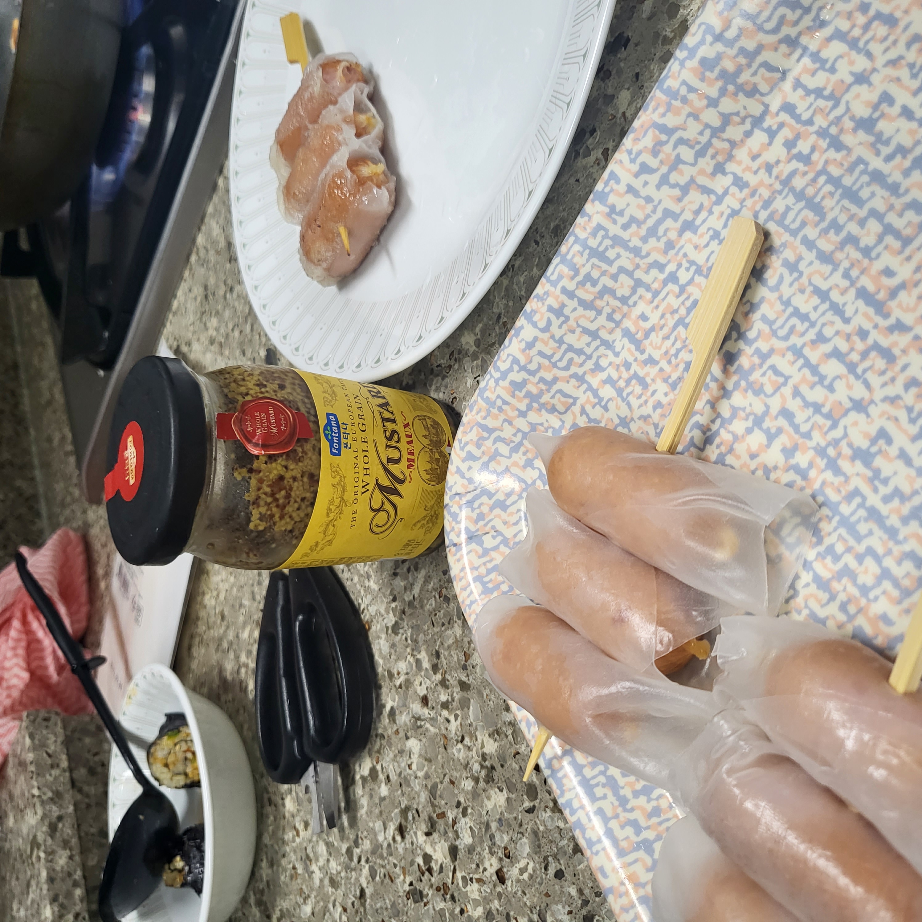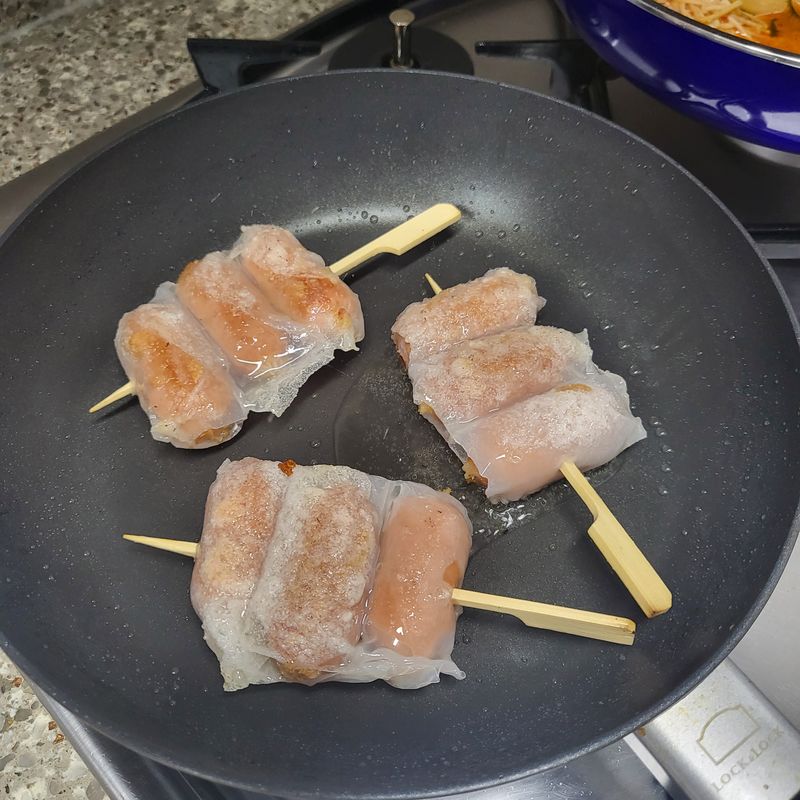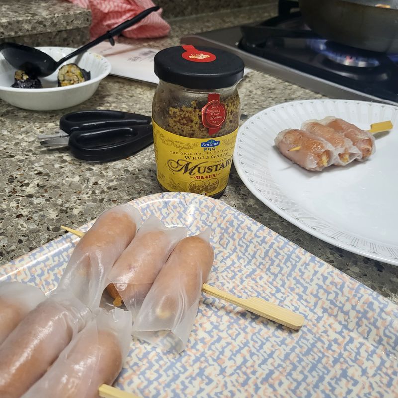 라이스페이퍼에 비엔나 소시지를 돌돌 말아서 꼬치에 끼워주면 준비 끝~~!