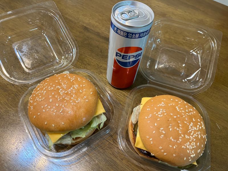 고기패티 + 데리야끼소스를 뿌리고, 양상추, 피클 + 치즈를 넣고, 빵을 얹으면 완성이라고 해요~ㅎㅎ