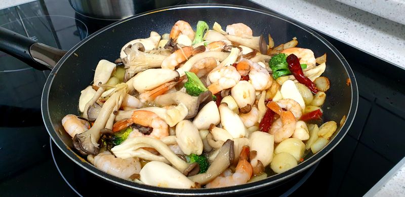올리브 오일에 마늘을 넣고 마늘향이 나도록 잘 볶다가 새우를 넣어 새우가 붉은 빛을 띄면