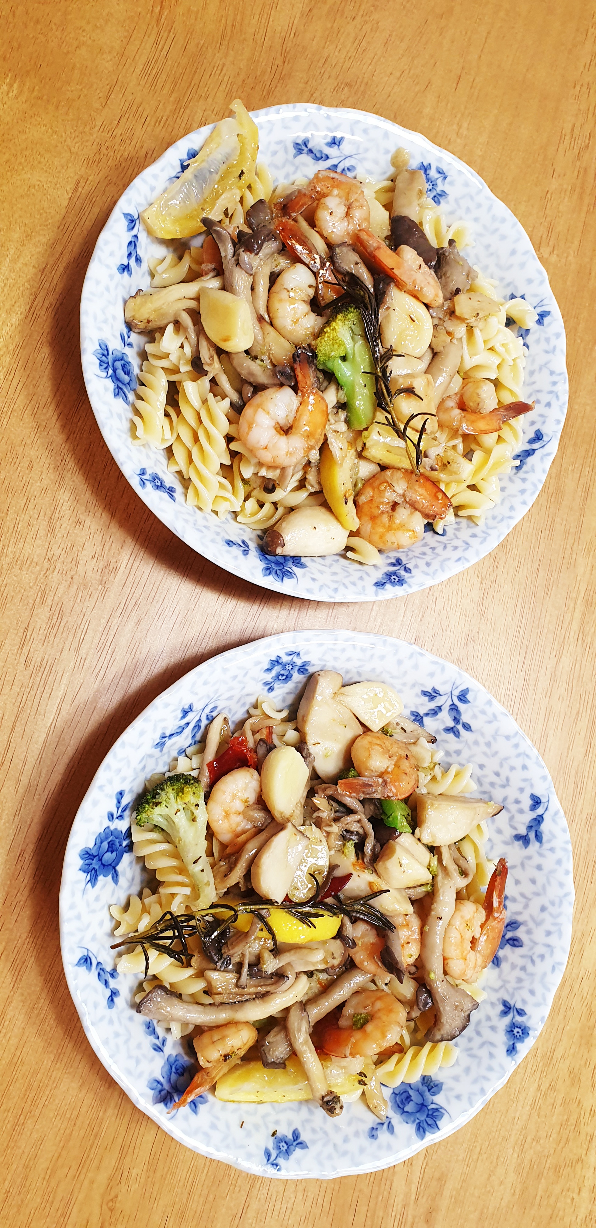 버섯, 브로콜리, 파스타를 넣고 달달 볶은 다음 풍미를 위해 레몬, 로즈마리, 베트남 고추를 넣어주고