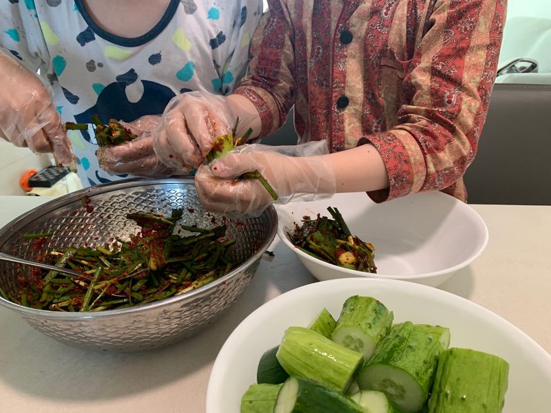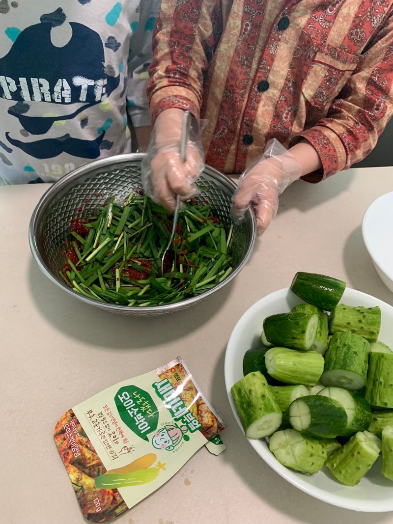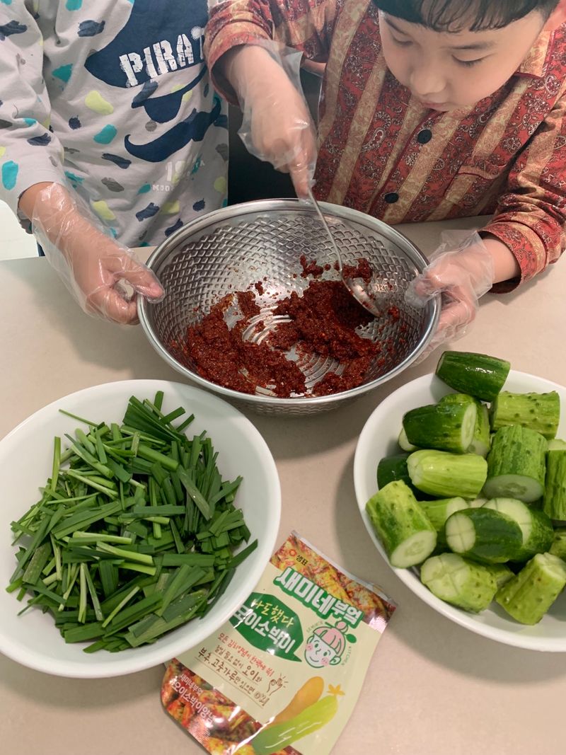 오이 소박이 레시피에 따라 아이들과 직접 재료를 손질하고 신나게 양념을 버무렸어요.