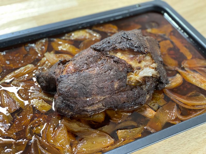 3) 리퀴드스모크와 꿀을 추가로 발라준 후 호일을 씌워 120도 오븐에 4시간 조리한다.