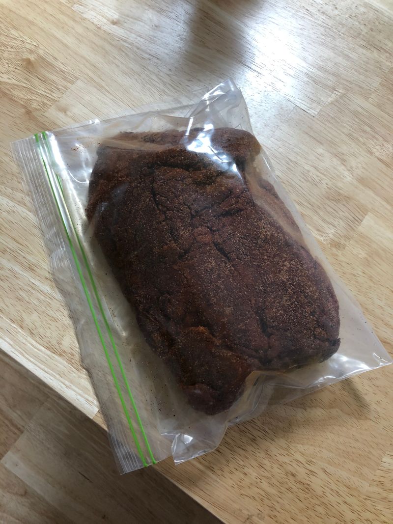 1) 목살에 각종 재료(소금, 후추, 설탕, 파프리카가루 등)가 들어간 럽을 바르고 냉장에 하룻밤 숙성시킨다.