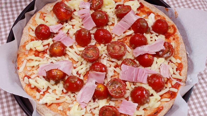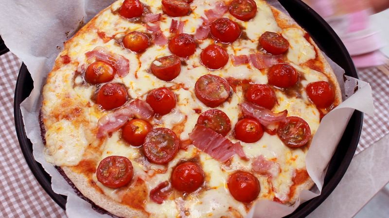 토마토소소, 모짜렐라치즈, 방울토마토, 베이컨을 올려 구워봤어요