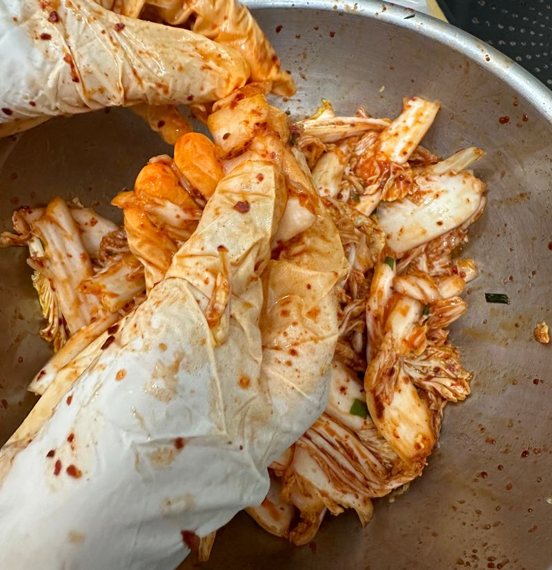 이때 우리집 겉절이 박사(새미네로 겉절이를 해본 다음부터 우리집 겉절이 담당박사가 되었어요)가 맛있게 겉절이를 무쳐주었습니다. 초딩이 하는거라 바닥에 자꾸 흘려 조금 귀찮고 맛 본다며 중간에 하두 먹어대서 1/5 은 줄어서 완성 되었지만 두개 맛은 극강입니다