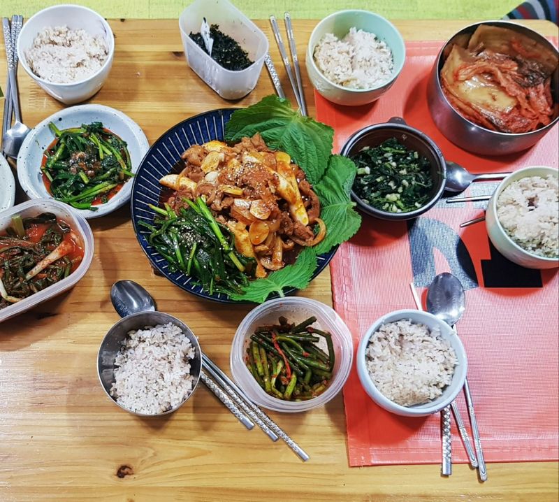 꽤 부들부들 양도 적당했고 야채도 든든하니 넣으니 존맛 ~ 💜 소스가 매콤해서 볶는 내내 코끝을 매운향이🔥🔥🔥🔥 간지럽혔는데 매콤한 고기 향긋한 부추까지 완전 꿀조합 쫄깃 쫄깃하면서도 촉촉한 식감이 매력적인 부추 가득 오리 불고기 깻잎과 무쌈에 올려먹으면 매콤 새콤한 맛의 조화에 뿅 반해버렸네요 야채와 고기가 적당히 어우러져 맛있달까 역시 한국인은 매운맛을 자꾸 찾게 되는듯해요