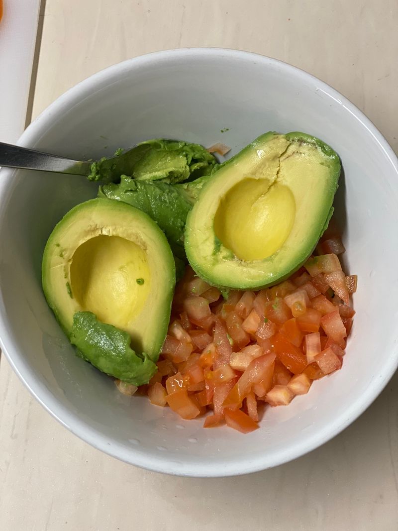 1. 아보카도를 으깨고, 토마토와 양파를 다져 잘 섞어주세요.