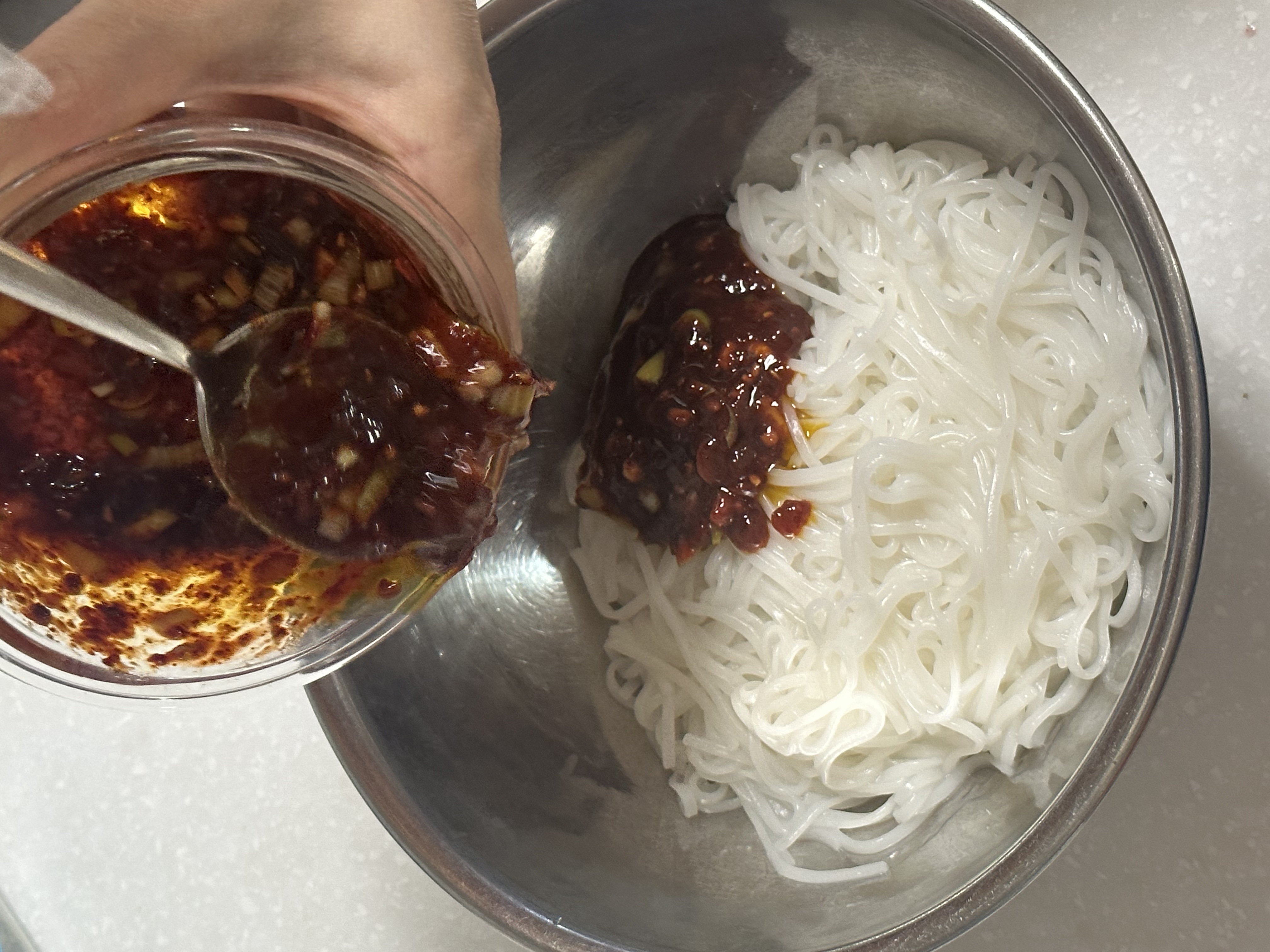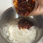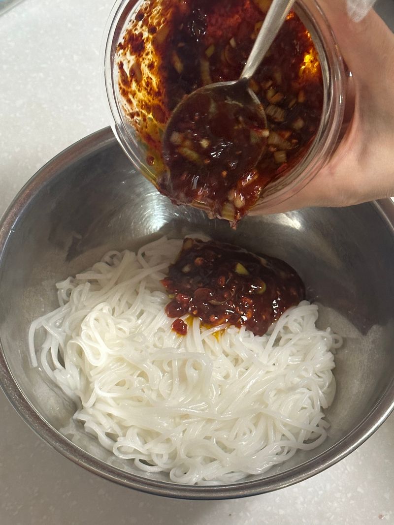 만들어둔 고추기름소스와 삶아둔 소면을 맛있게 비비고,