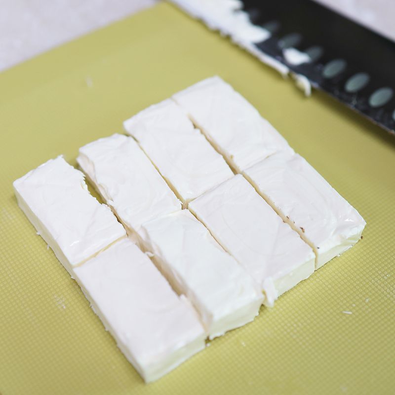3. 크림치즈와 견과바를 세로로 잘라주세요.