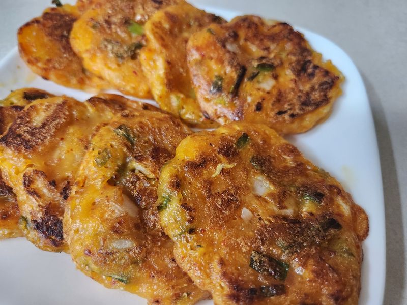 김치전할때 김치국물도 같이 넣어주면 더 감칠맛 나는 김치전이 되네요. 항상 크게 부쳐서 먹었는데 저렇게 작게 부쳐먹으니 겉이 더 바삭한것 같아요.