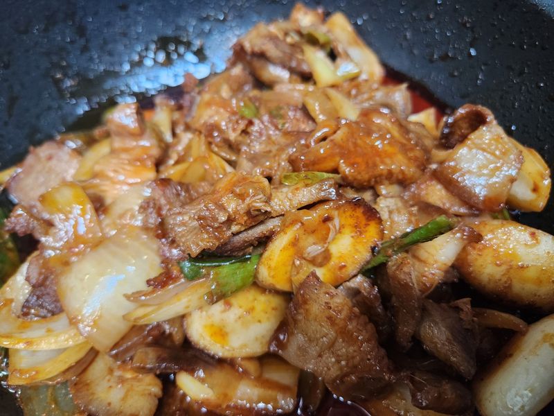 앞다리살로 만든 제육볶음 양파, 감자, 대파를 듬뿍 넣어서 만들면 고기의 느낌함을 잡아주네요.