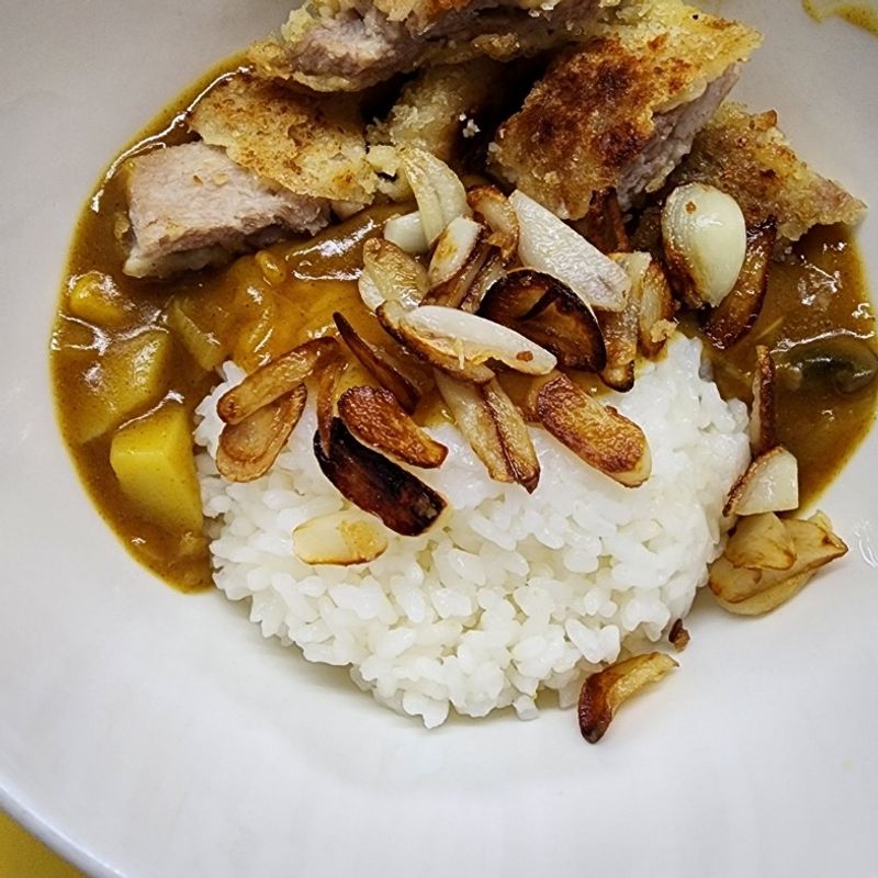 나름 마늘도 편썰어 따로 굽고 냉동돈까스도 구워서 카레밥과 함께 플레이팅해봤습니다.^^