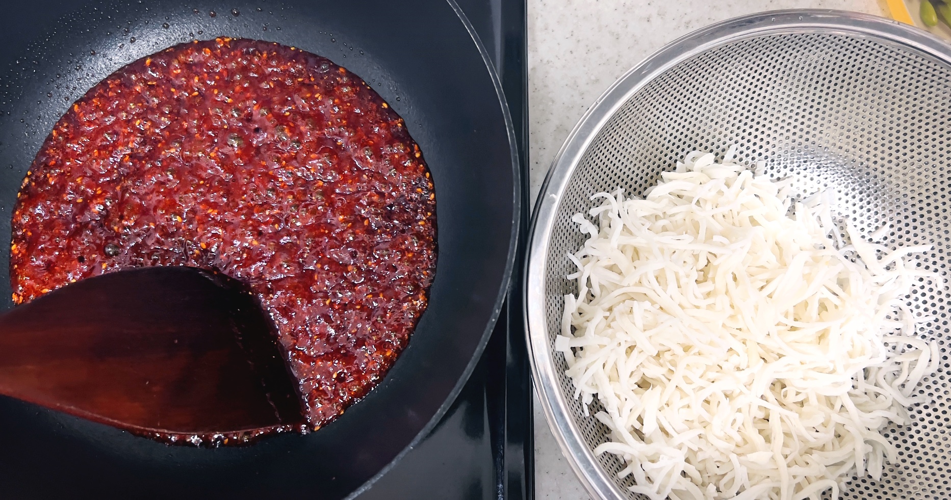 주걱으로 섞어보니 제가 익숙치 않아서 생각난게 짜장면 섞기 였습니다!