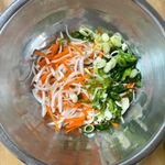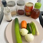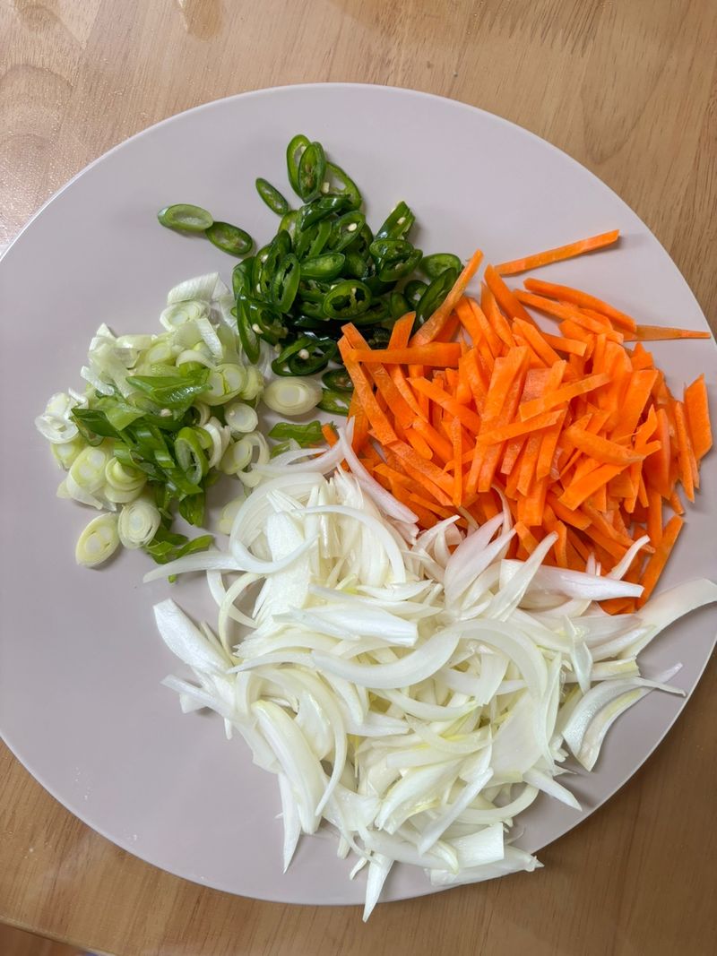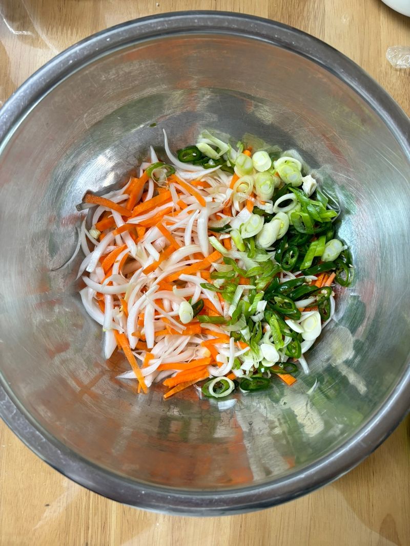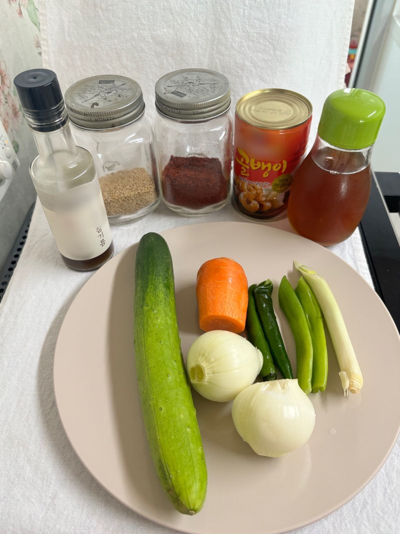 재료는 4인 기준 골뱅이 세 캔, 참기름 4.5스푼, 연두 9 스푼, 식초 8스푼, 초고추장 3스푼, 섵탕 2스푼, 고추장 6스푼, 고춧가루 3스푼, 참깨 3스푼, 오이 3개, 채 썬 양파 2개, 당근 0.7개, 고추 2개, 대파 1개 준비해주시면 됩니다!