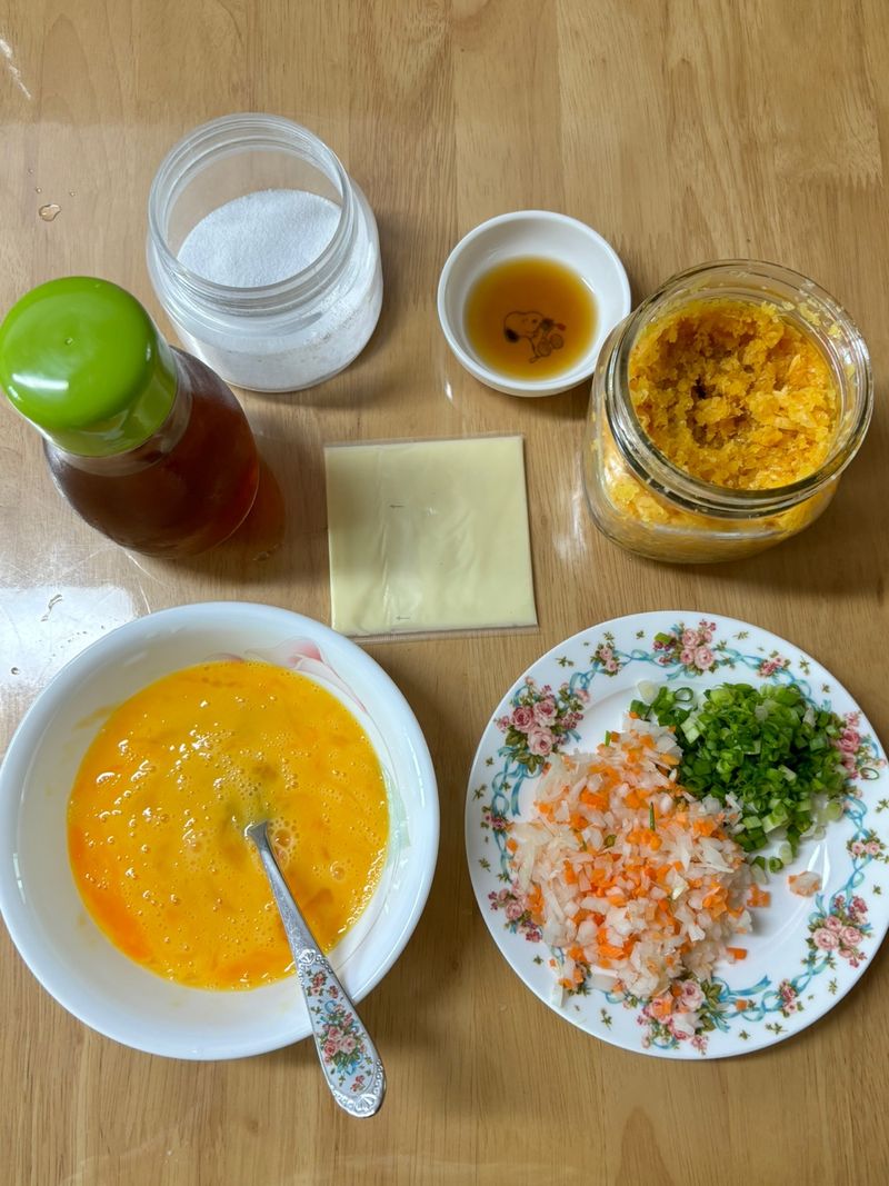 재료는 김밥 김, 밥 1.3공기, 소금 반 스푼, 참기름 3스푼 (1.5스푼은 밥에 넣고, 1.5스푼은 칼과 김밥에!), 마늘 0.5스푼, 계란 3개, 연두 1스푼 양파와 당근, 쪽파 2줄, 단무지 2개, 맛살 2개, 햄 두 개만 있으면 됩니다. 취향에 따라 시금치나 치즈 준비해주세요!