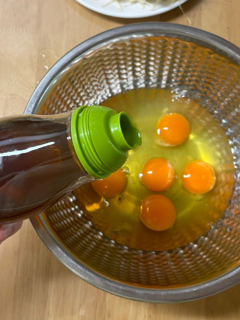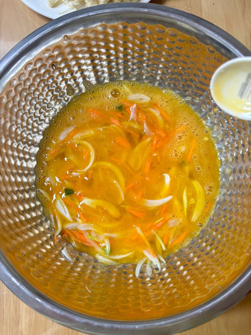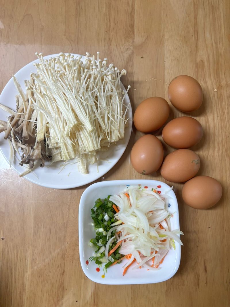 팽이버섯 전 3인분 기준 재료는 팽이버섯 2개, 느타리 버섯 1개(선택), 연두 세 스푼, 달걀 8개, 쪽파 3줄기, 식용유, 채 썬 당근과 양파 입니다.