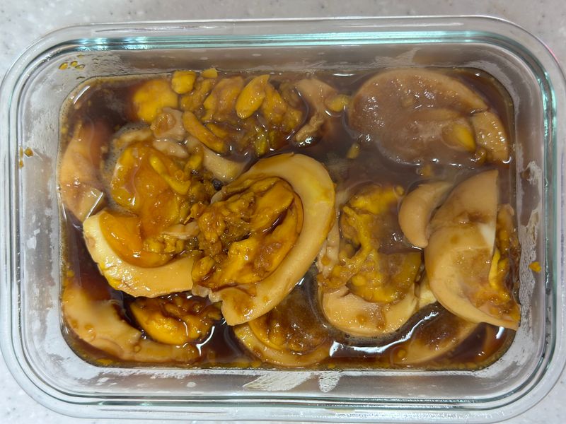 저희 엄마는 계란장을 반 잘라서 해주셨었어요. 국물은 좀 지저분해지지만, 간이 더 잘 배어서 너무 맛있답니다. 저도 그렇게 해보려고 끓기 시작하고 나서 반 갈라보았는데, 아.. 반숙계란은 반 갈라선 안되는 거였나봐요.