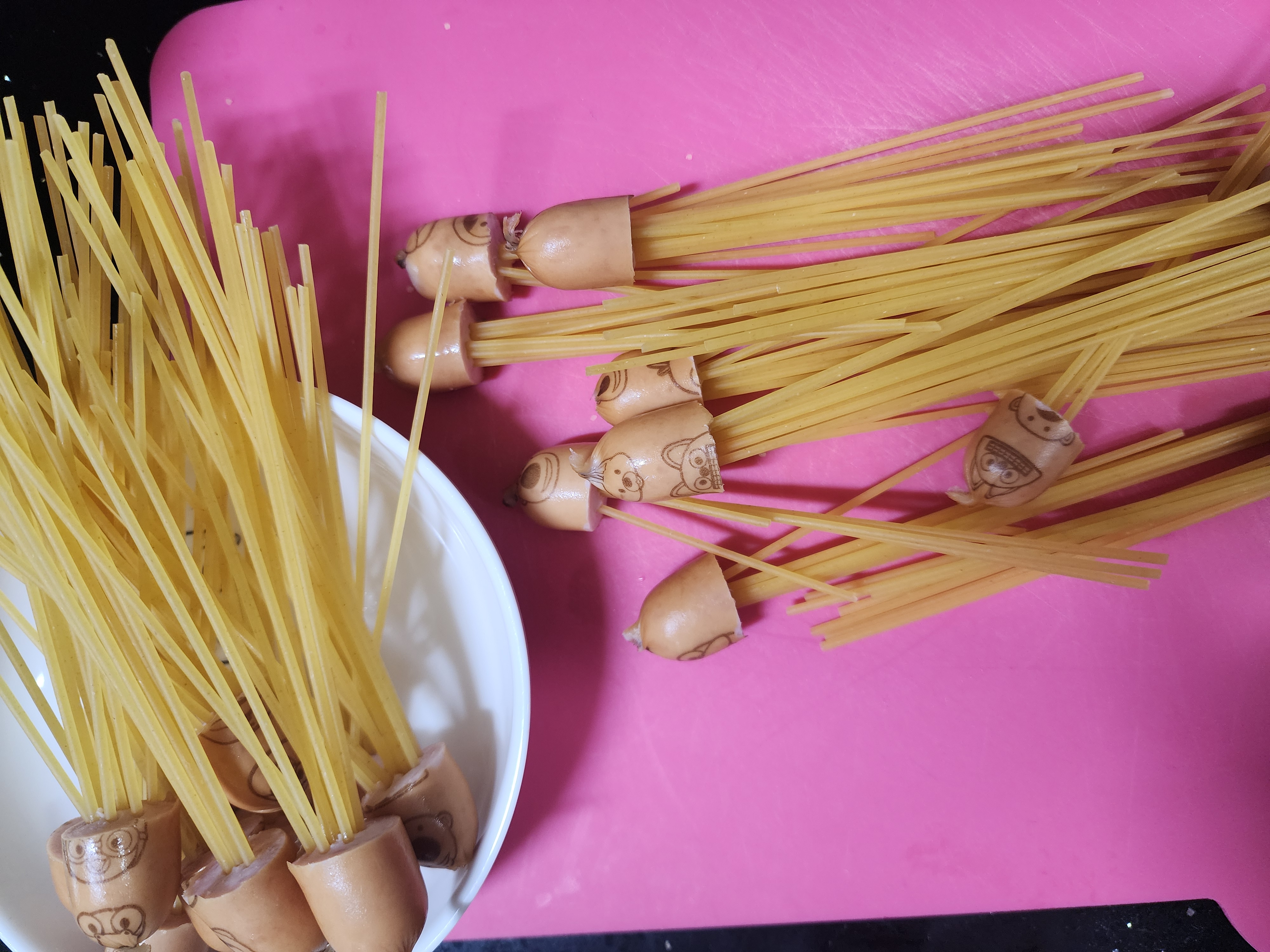 스파케티 면을 반으로 자르고 비엔나 소시지도 반으로 썰어주세요. 비엔나 소시지에 스파게티 면을 꽂아주세요