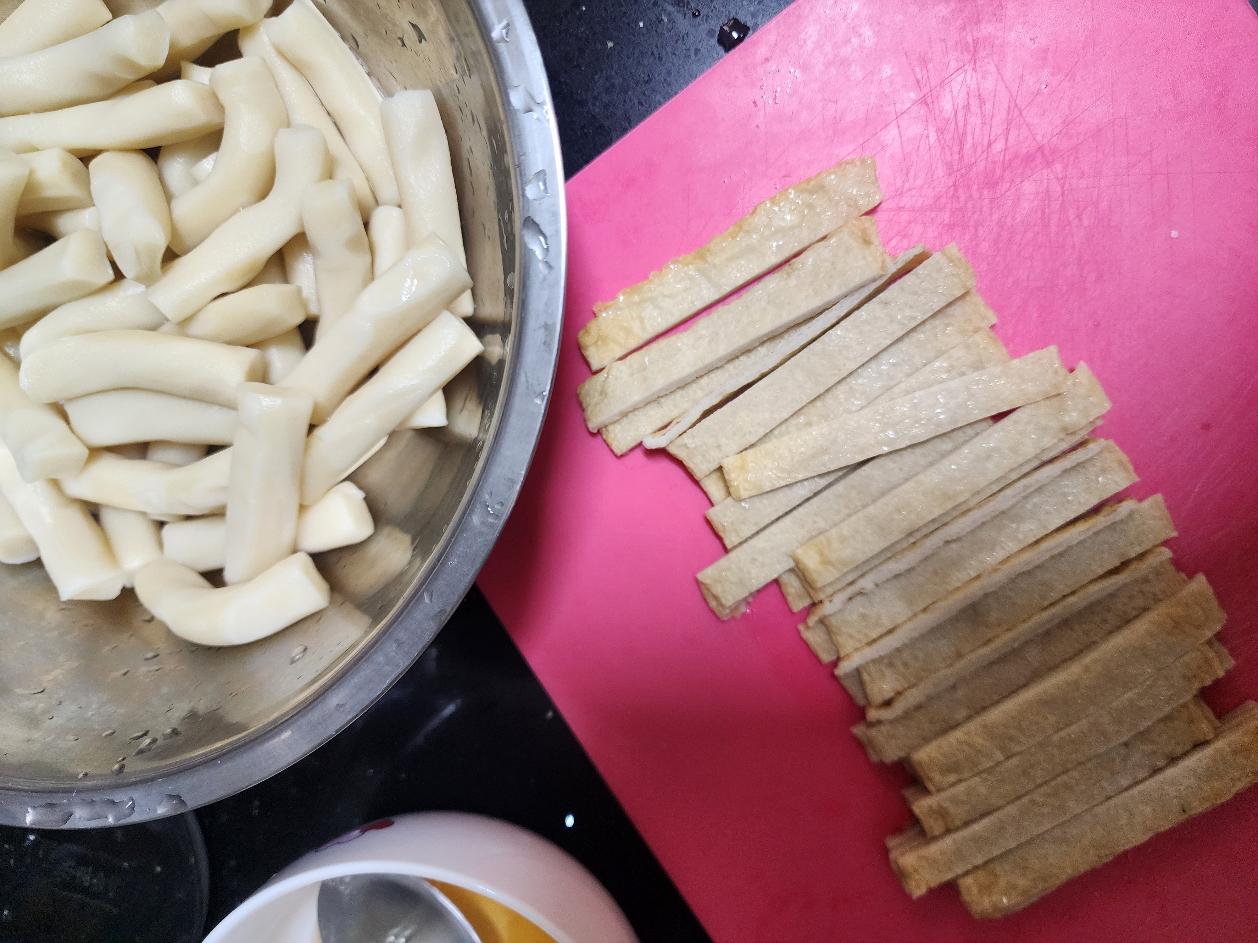 집에 있던 떡볶이 떡은 냉동되어 있던 거라서 흐르는 물에 담가서 조금 녹여 준 후