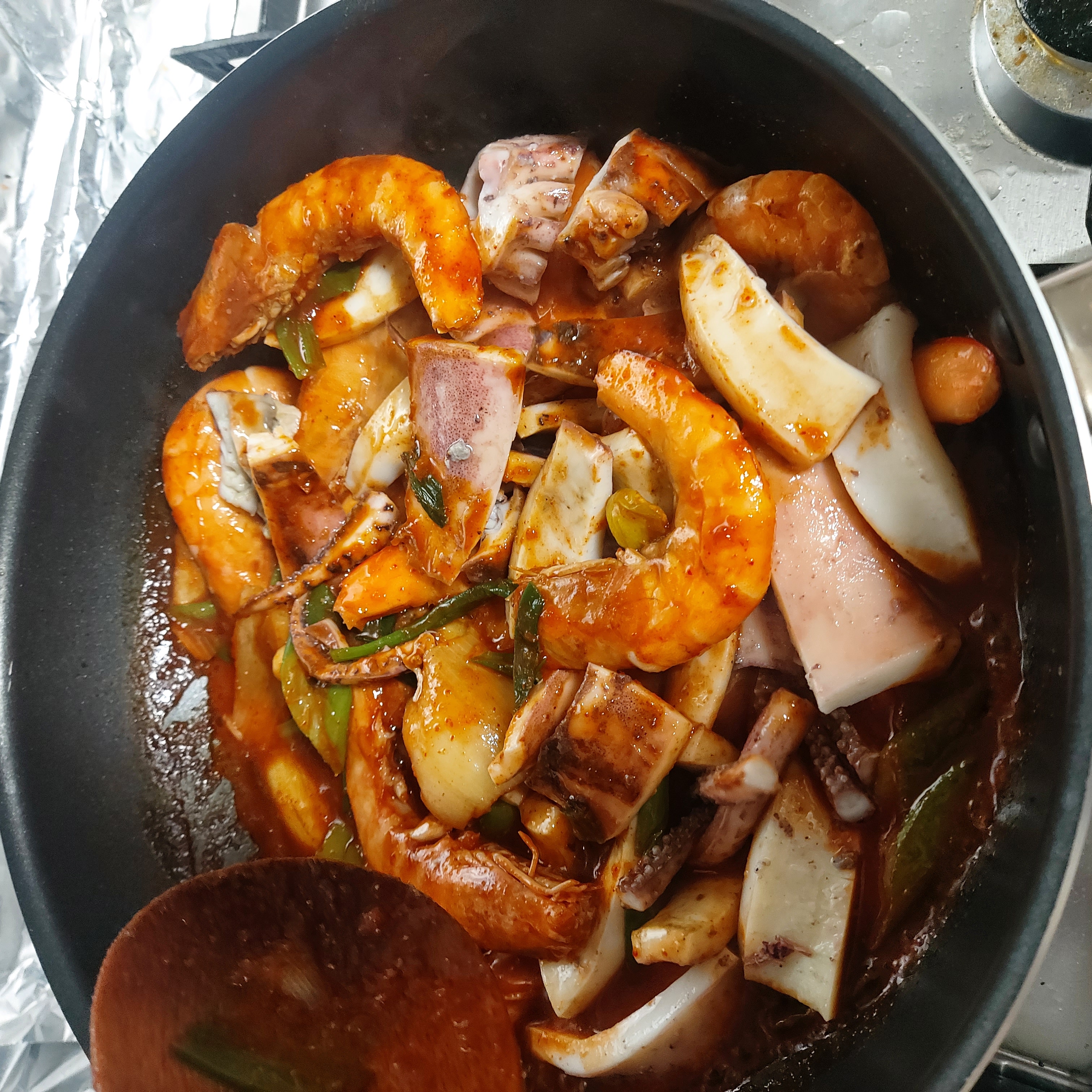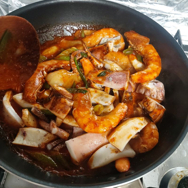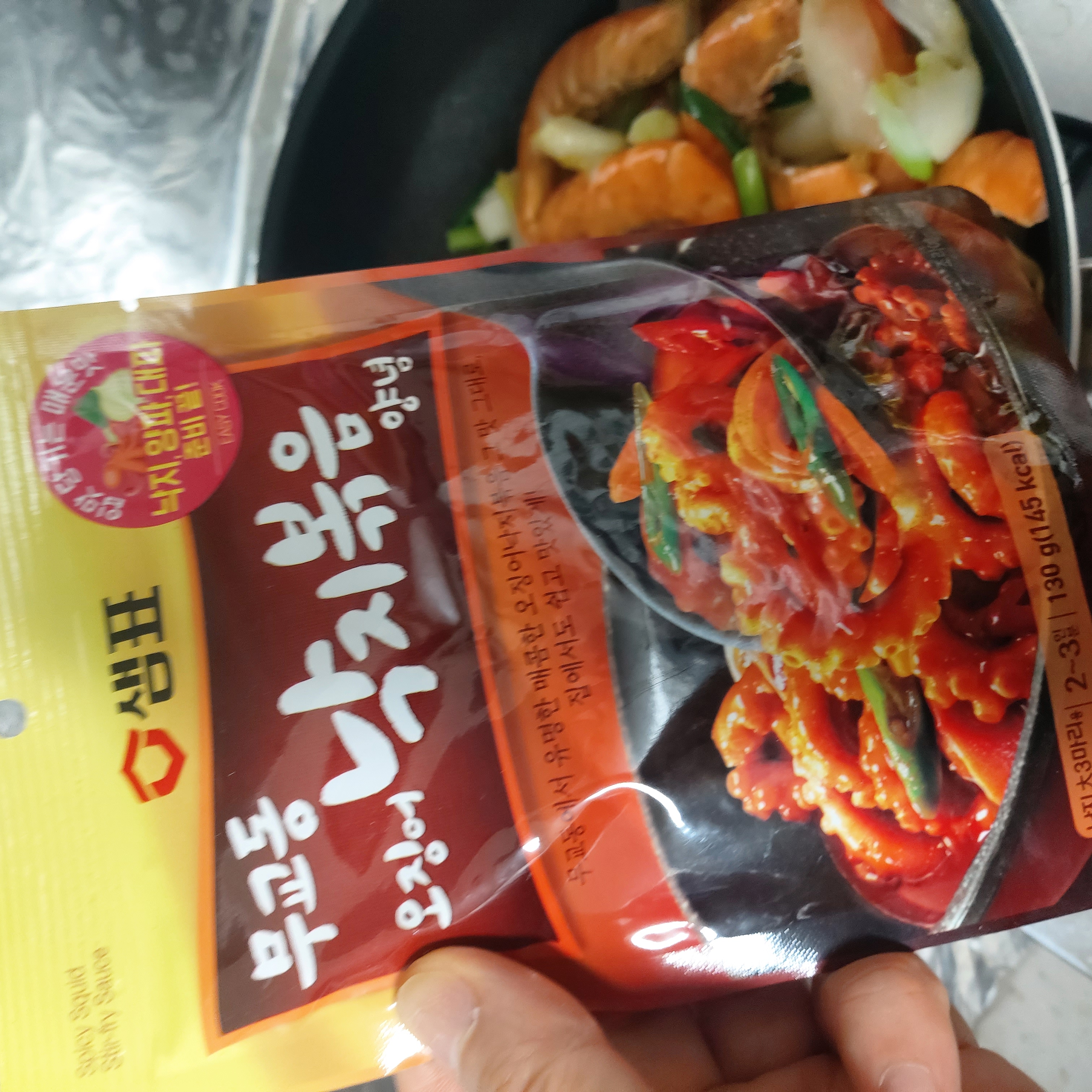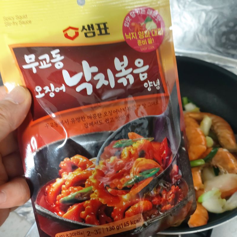샘표소스를 활용한 요리 정말 간단해요. 무교동 오징어 낙지 볶음 양념 소스만 있으면 반은 준비 끝! 낙지가 없는 관계로 새우로 교체 손질한 오징어,새우, 마늘, 파, 양파에 소스와 물 살짝만 넣고 휘리릭 볶기만하면 끝! 마지막으로 깨소금 솔솔. 정말 간단하게 요리해서 먹을수있어서 좋아요