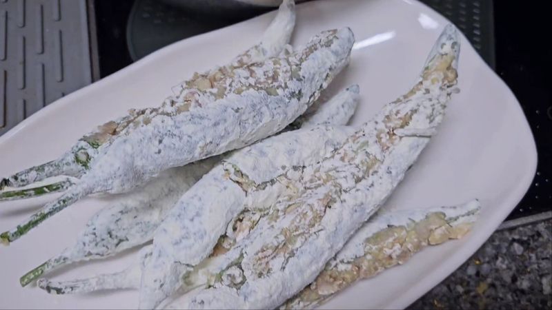 오이 고추를 반으로 가른 뒤 속재료를 넣고 밀가루 옷을 입힌다