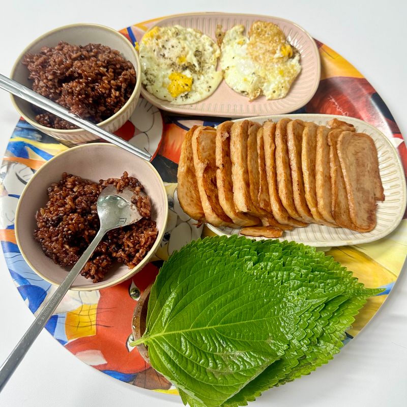염증에 좋다고 수수 넣고 지은 밥에 따끈한 스팸과 깻잎 조합 맛있겠죠? 😊