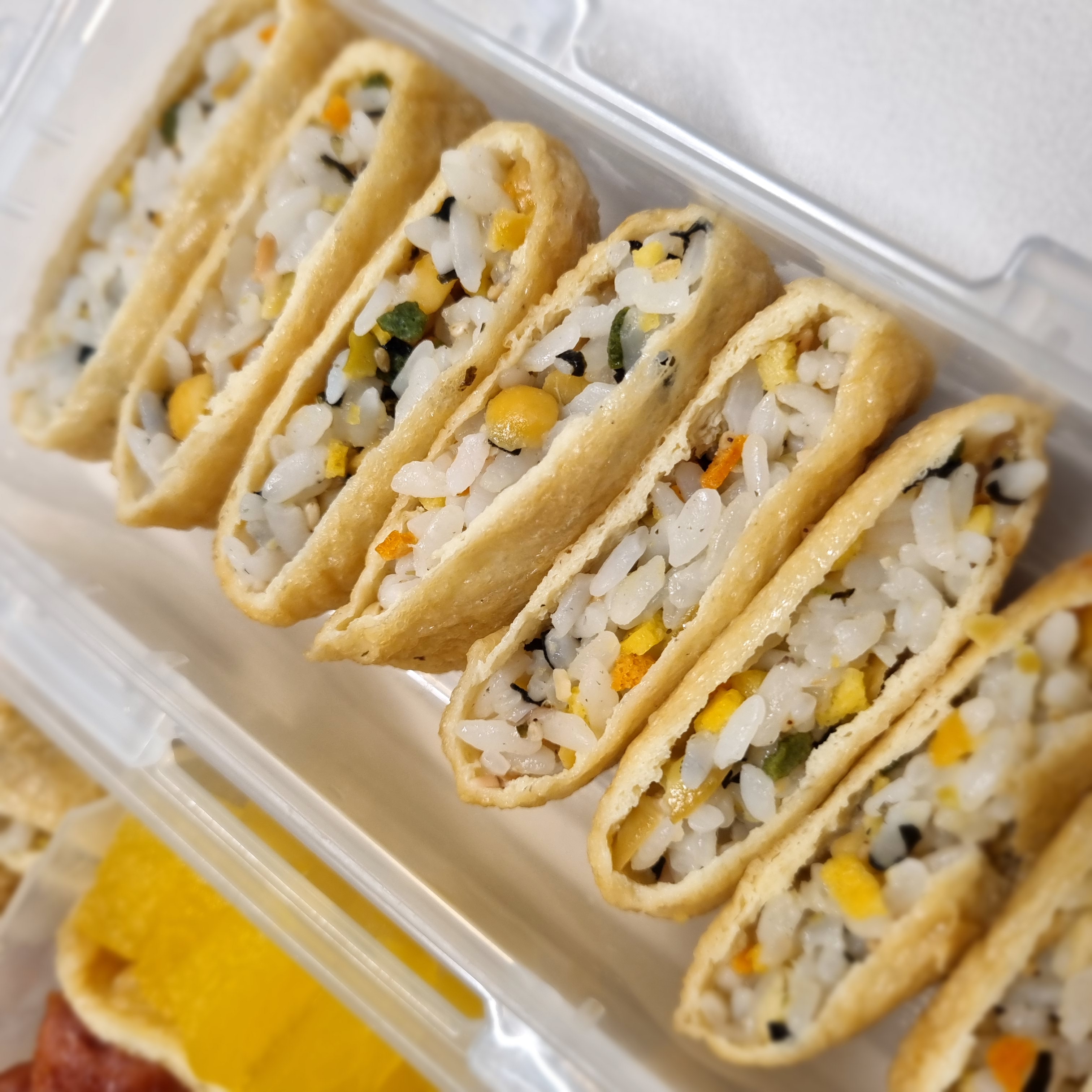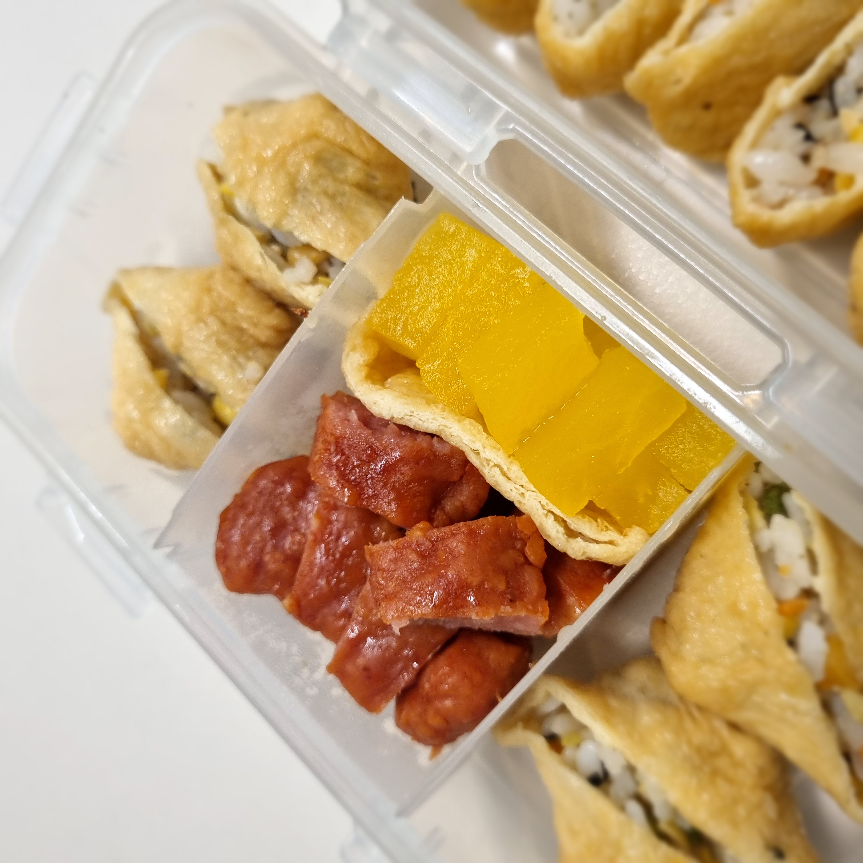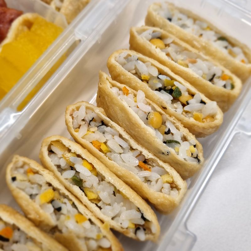 아이 도시락을 처음 싸보았습니다. 요리가 서툴러서 sns에서 보는 멋진 도시락은 못됩니다. 병아리콩밥에 밥친구섞어 새콤소스 비벼서 유부로 감쌌습니다. 반찬은 단무지와 소세지를 작게 잘라 넣었습니다. 편의점에서 5천원 주면 훨씬 맛있고 푸짐한 도시락을 살 수 있지만 직접 만드는 동안 행복이 느껴졌습니다.