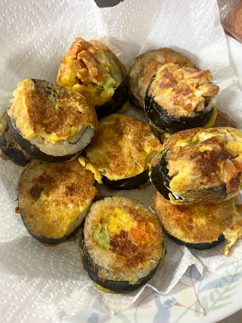 예전에 엄마가 남은 김밥으로 이렇게 해주셨던 게 생각나서 계란물 입혀 부쳐 먹었어요!