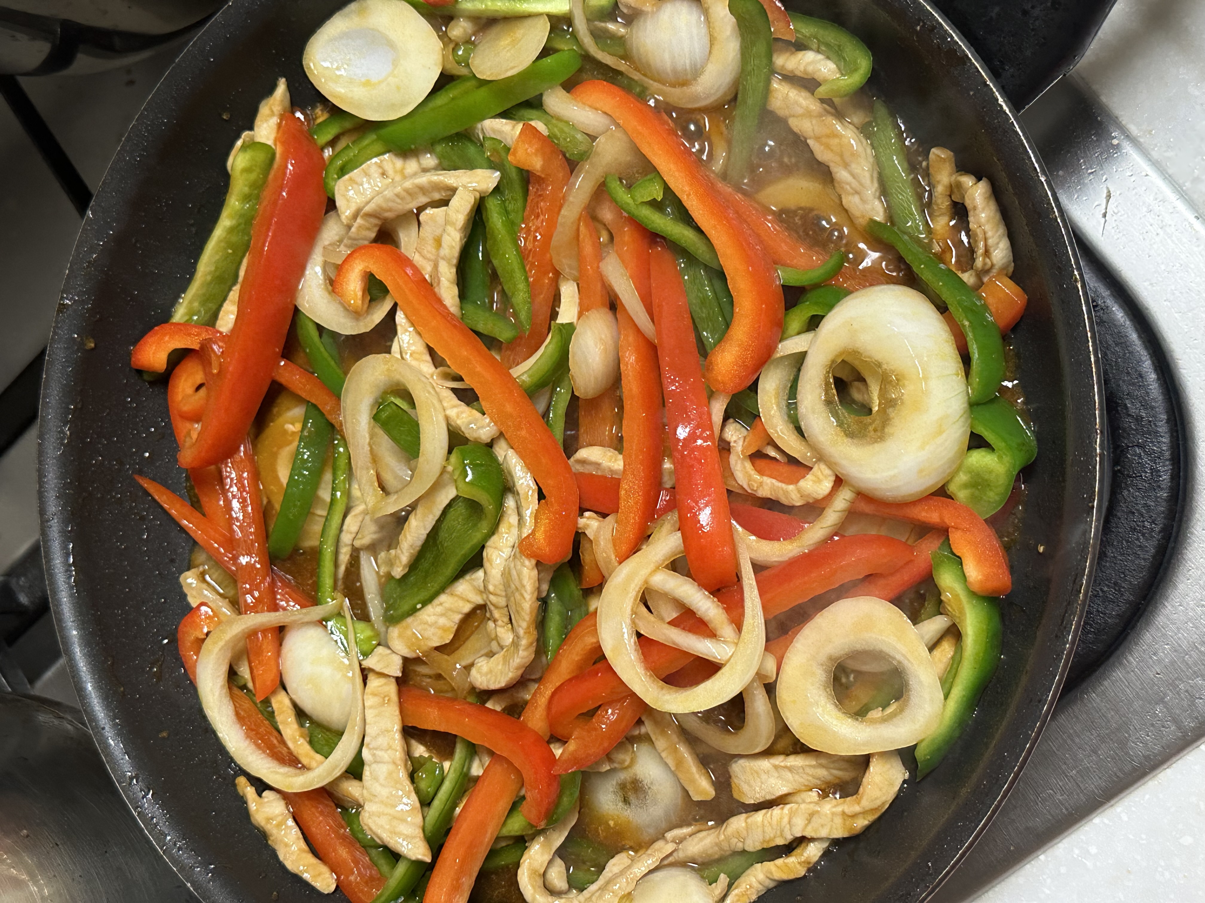얇게 썰어 놓은 파프리카 세 덩이랑 양파, 잡채용 고기에 소스만 붓고 졸여내면 끝!
