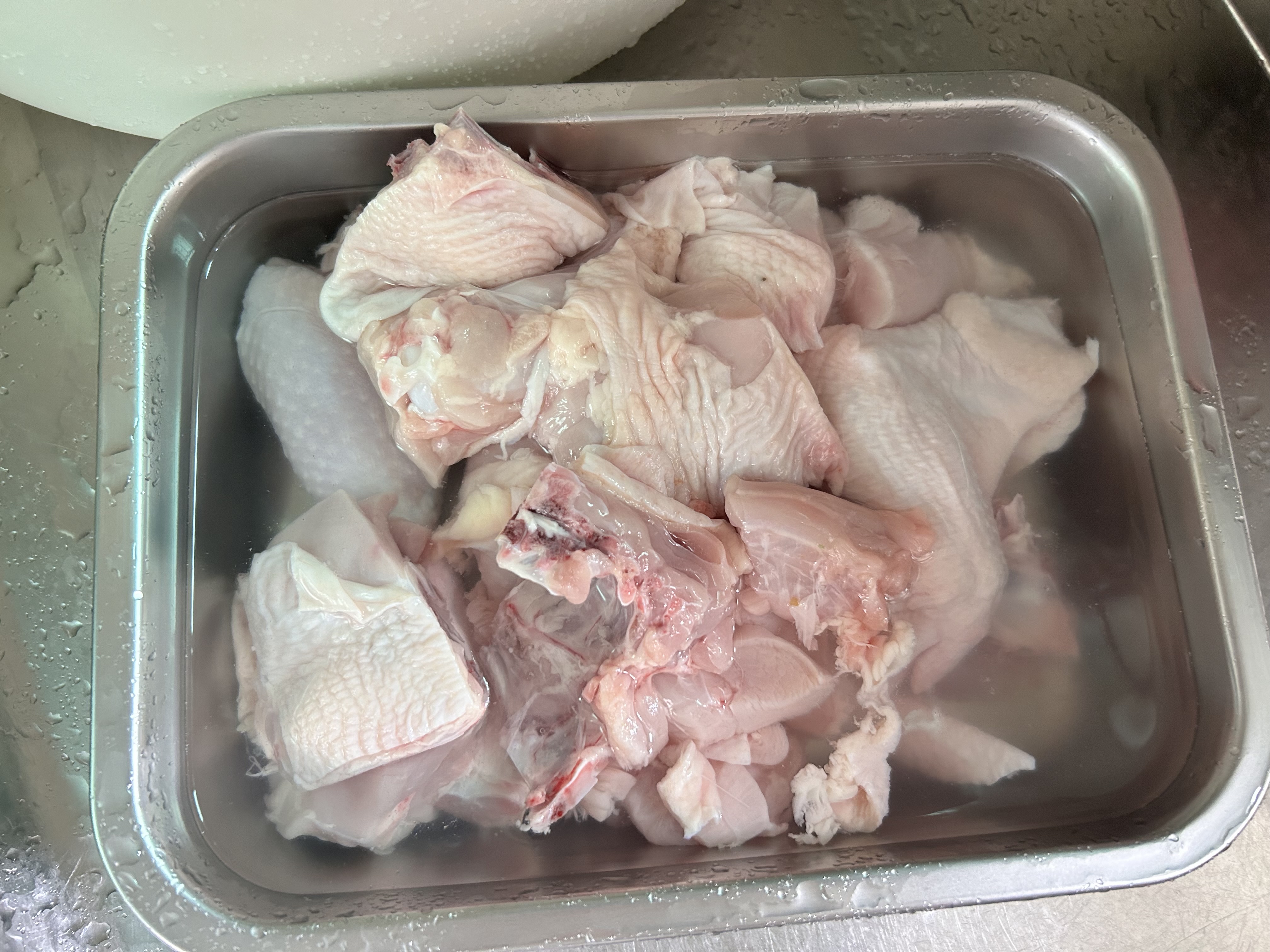 닭 내장을 재거하고 칼집을 내서 물에 담가주세요.