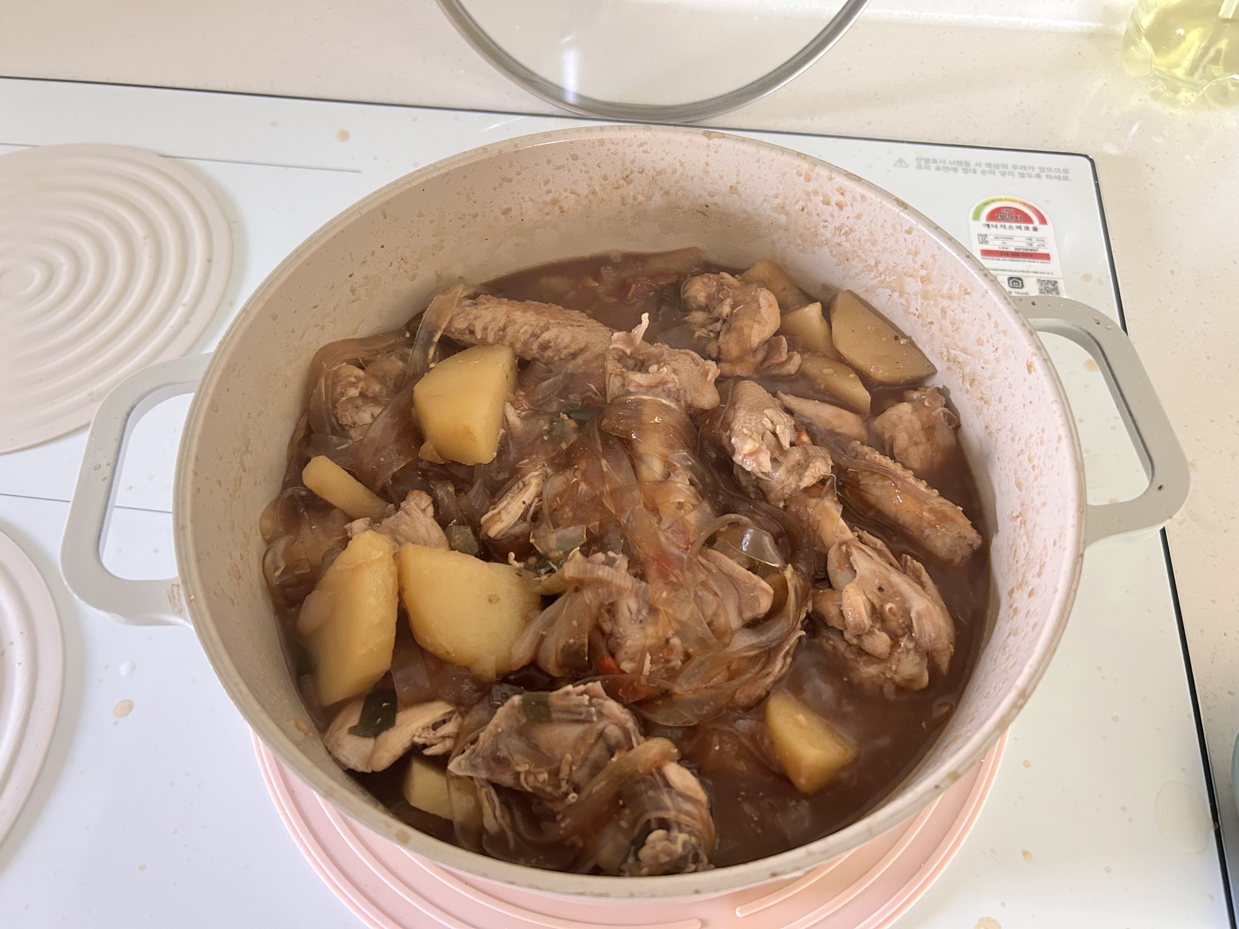 물 800ml를 넣어서 끓이고 식초 1T를 넣어줍니다. 감자를 넣고 뚜껑을 닫아 15분간 끓인 후, 뚜껑을 열고 추가 5분간 졸여줍니다. 그 후 당면을 넣어주면 끝!