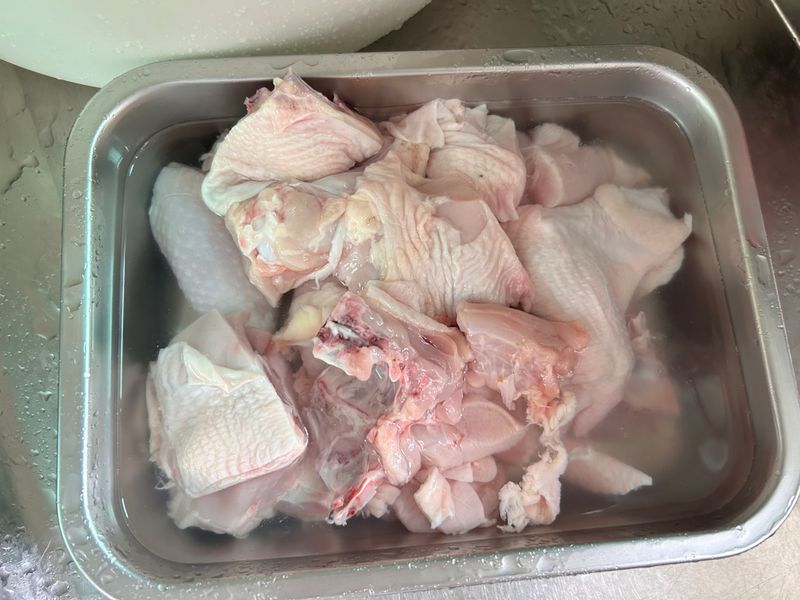 닭 내장을 재거하고 칼집을 내서 물에 담가주세요.