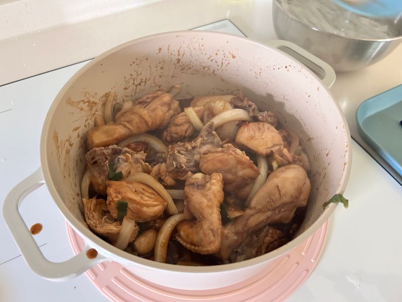 닭이 익으면 만든 양념을 부어주고, 양파와 파를 넣어 볶아줍니다.