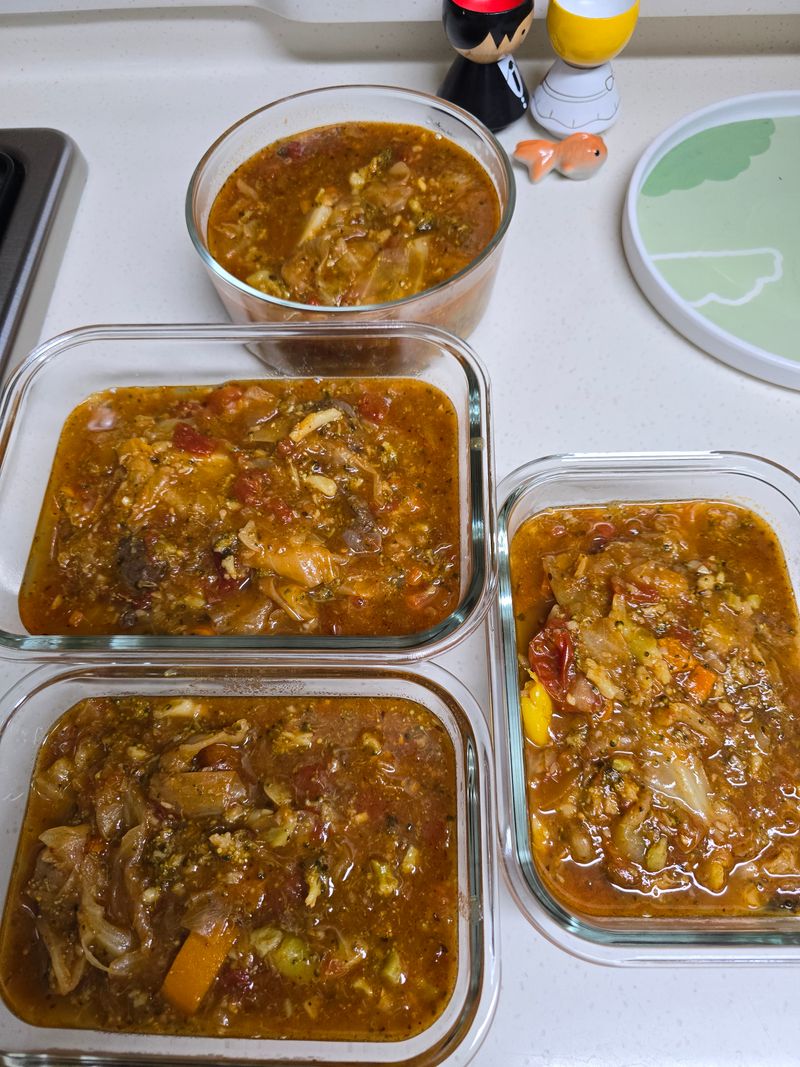 여행 등의 사유로 체중이 급격히 증가했을때 대량으로 만들어놓고 며칠동안 식사대용으로 데워먹으면 좋은 마녀스프입니다!!