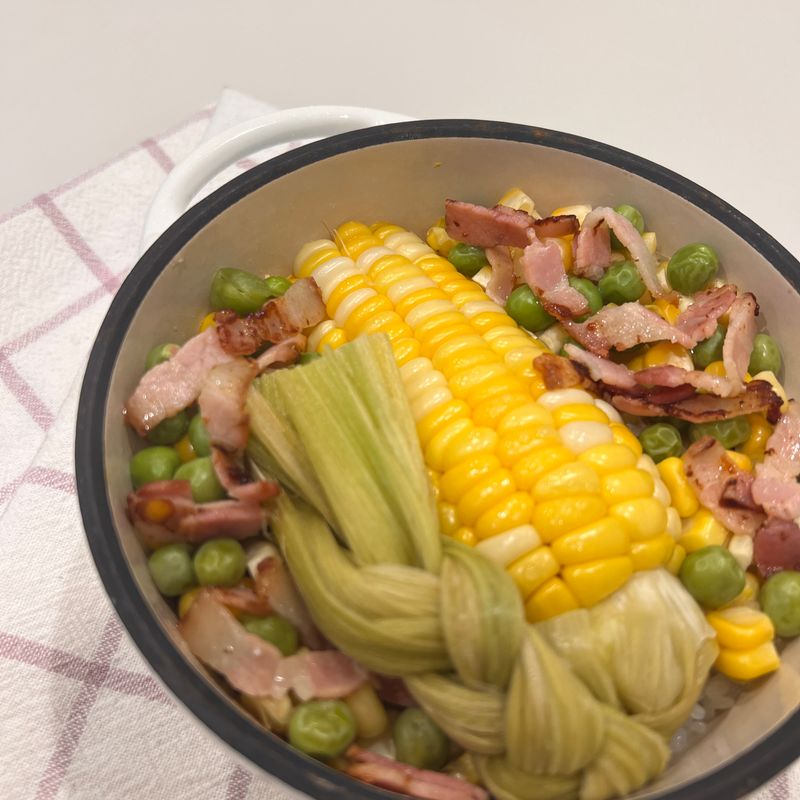 1. 쌀은 씻어 30분 정도 불려주세요. 2. 불린 쌀을 들기름으로 코팅한 솥에 넣고 살짝만 볶아주세요. 3. 쌀과 물 비율을 1:1로 넣고 그 위에 초당옥수수, 완두콩 넣어 중불에서 10분간 끓여주세요. 4. 약불로 줄여서 10분, 뜸도 5분 들여주세요. 5. 마지막에 베이컨이나 버터도 추가해서 섞어드세요.