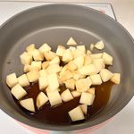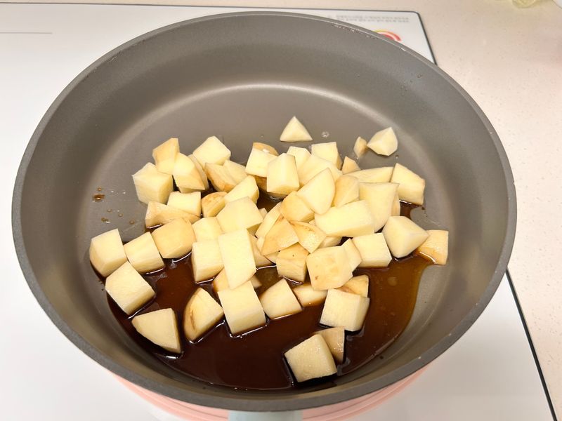 후라이팬에 감자를 넣은 후 양념과 물을 조금 넣어 끓어줍니다.