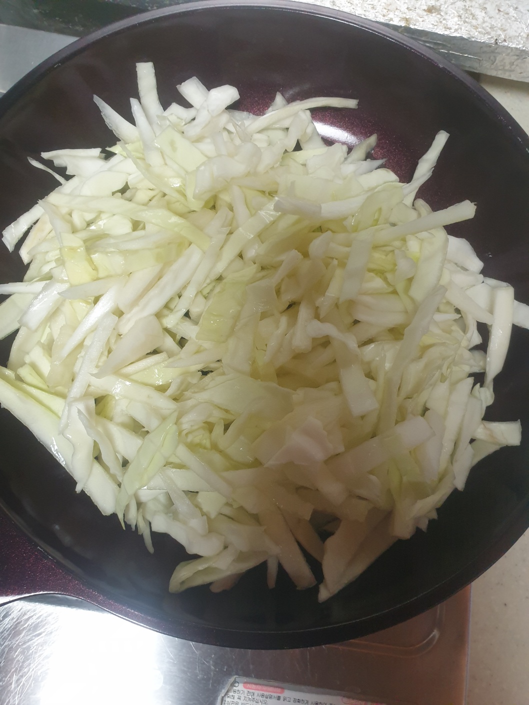양배추 얇게 채썰어, 팬에 물과 연두넣고 물이 끓으면 중불에 양배추넣어 부드러워질때까지 끓여주다가,