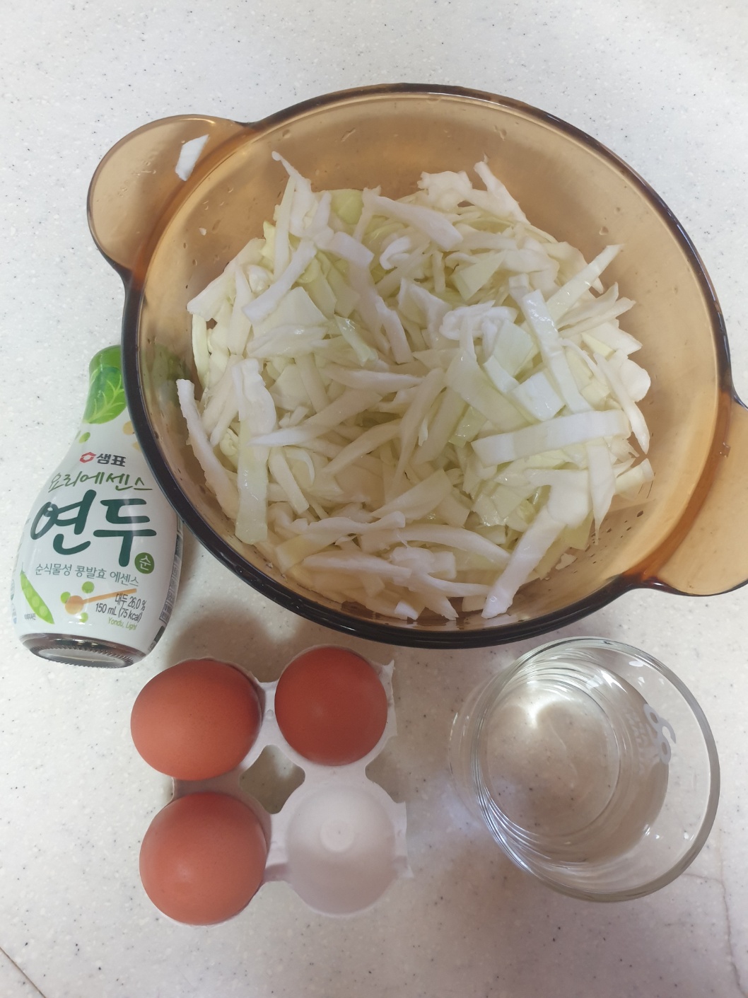 재료는 양배추(250g), 달걀3개(150g) 물1컵(200ml) 연두1스푼(10g)