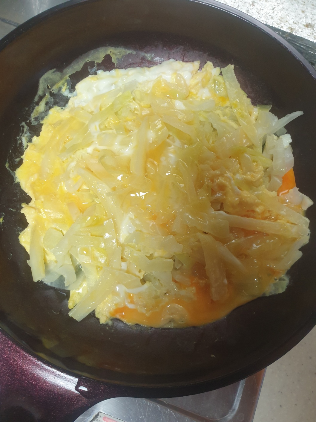약불로 줄인후 달걀을 풀어 양배추위에 넣어주고 뚜껑을 덮어 윗면이 익을때까지 천천히 익혀주면 완성!