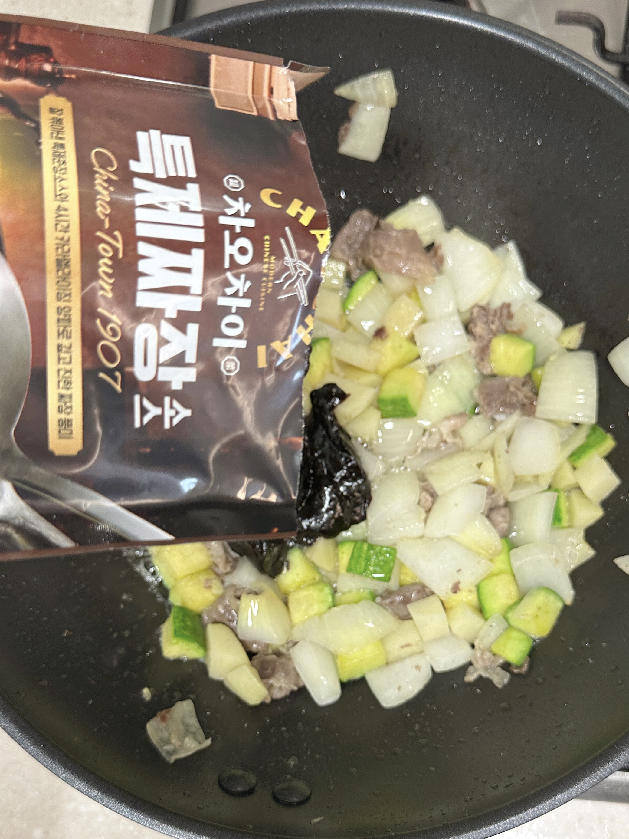 재료 준비를 마친 뒤 레시피에 나와있는 데로 고기 볶고, 채소 볶고, 짜장 넣고 볶아 주었는데요