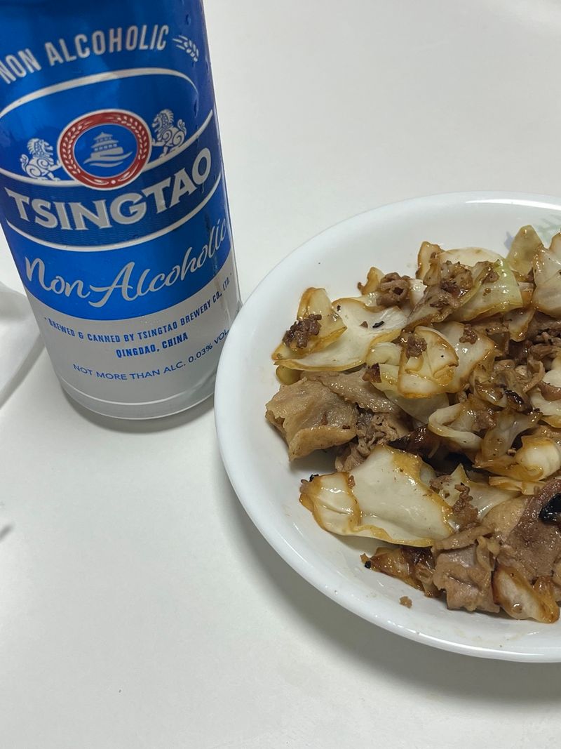 휘리릭 볶아 야식으로 칭따오 논알콜이랑 같이 먹었어요.