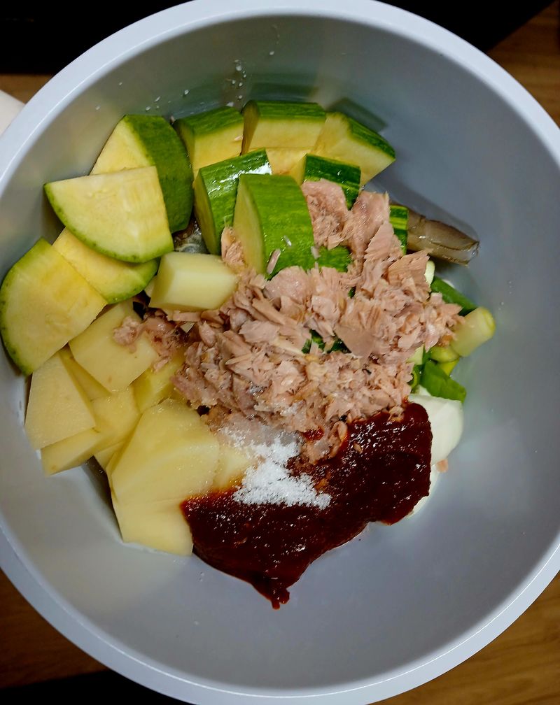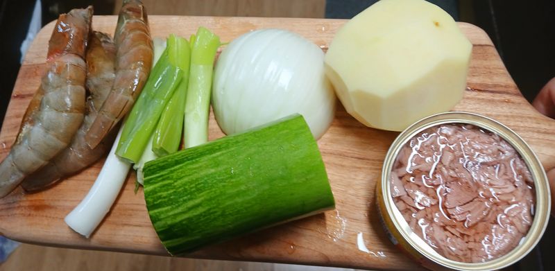 1.손질된 감자1개, 대파1개, 양파1개, 호박2/3개와 참치캔, 새우4마리를 준비해주세요.