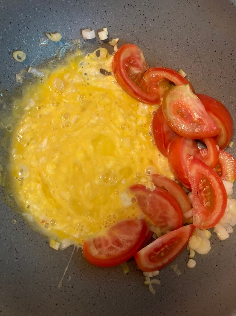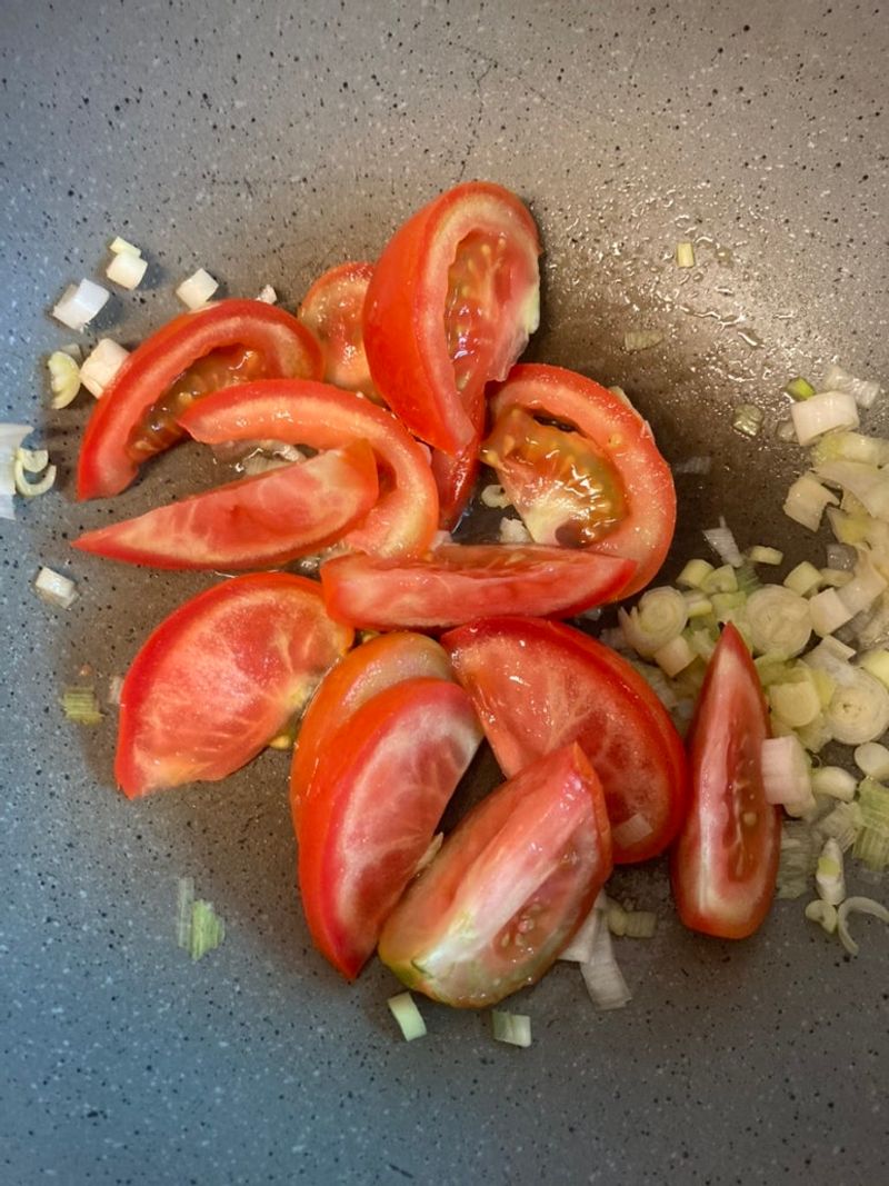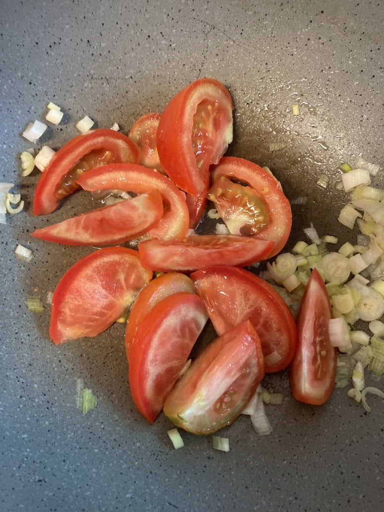 Step 2. 파를 볶다가 토마토를 볶아줍니다