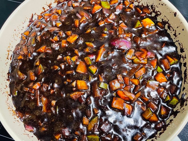 차오차이 특제짜장소스 1봉 넣고,3분 더 볶아주세요! 전 물도 한 컵 넣었답니다~ 재료가 모두 익으면 완성!
