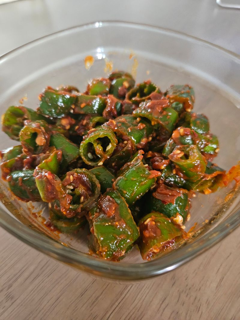 아삭이 고추를 적당한 크기로 깍뚝 잘라요 된장만 넣어도 너무 맛잇는데 색 이쁘라고 고추장, 고춧가루도 살짝!! 윤기 좌르르하게 참기름 물엿도 살짝!! 저녁에 고기구워서 맛잇게 먹을게요~^^