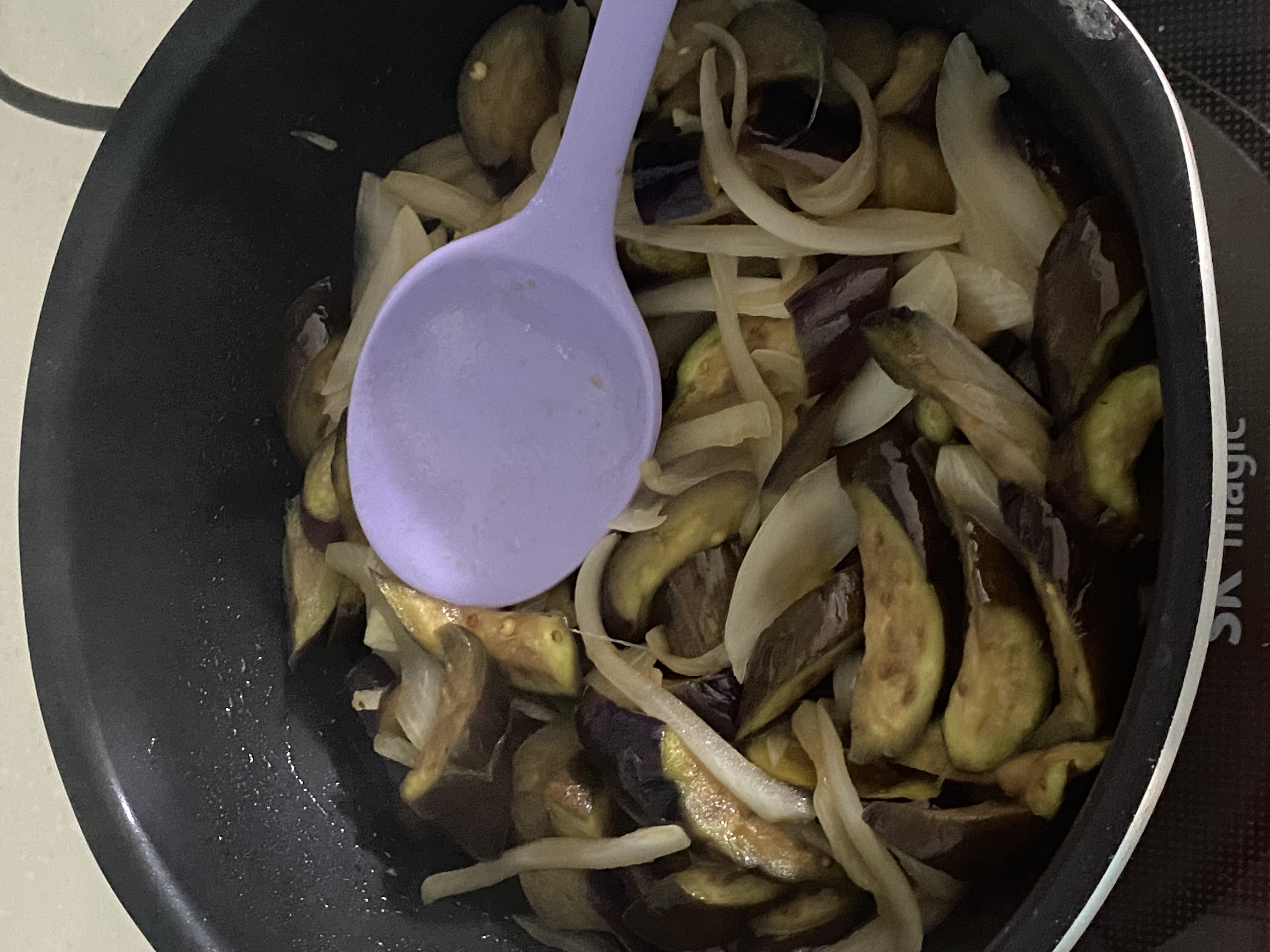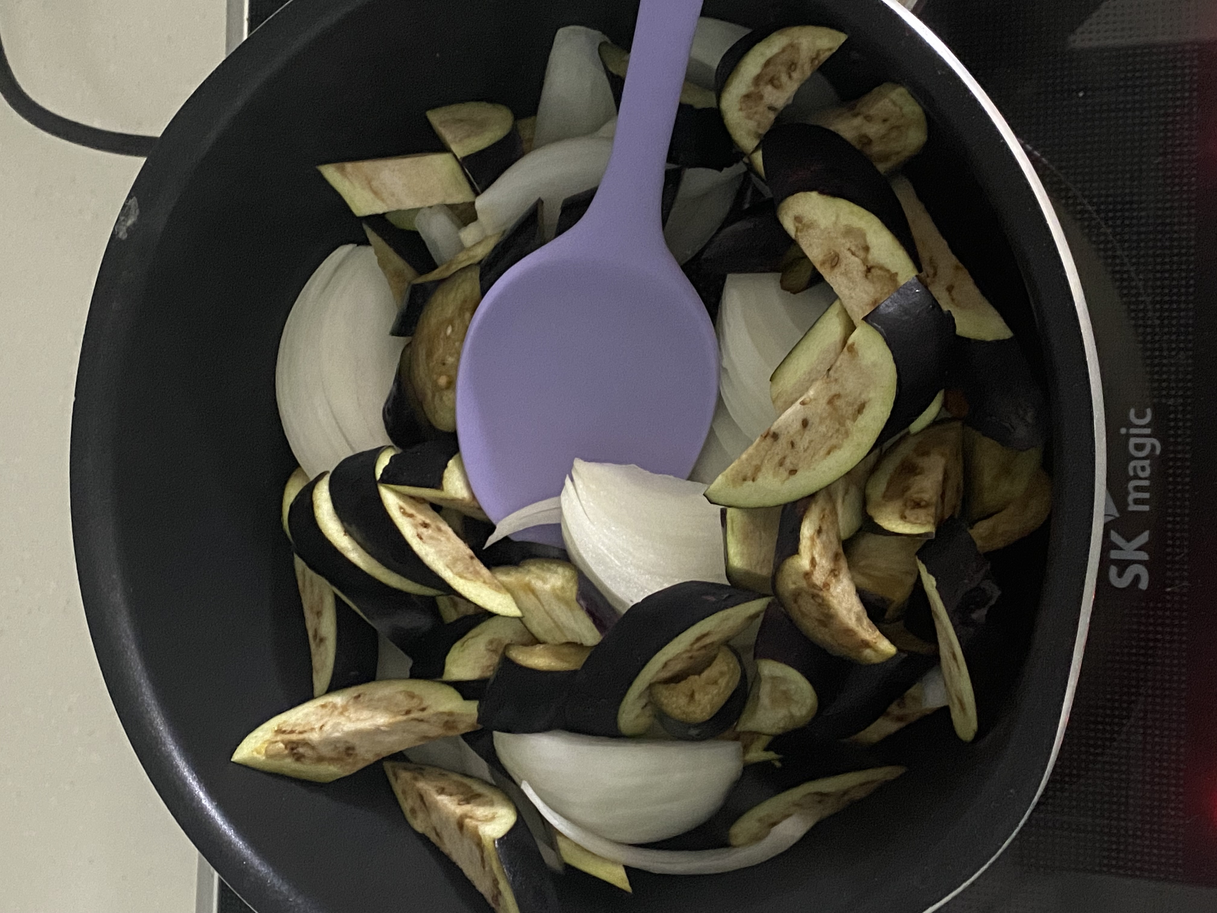 기름을 두르고, 가지와 양파를 볶아줍니다.