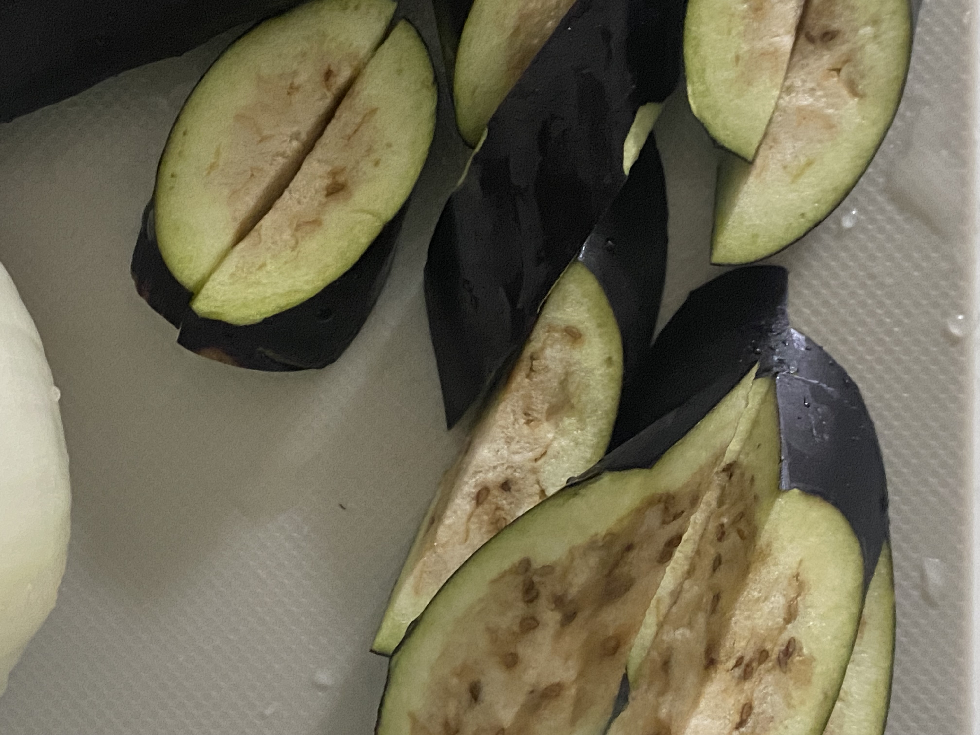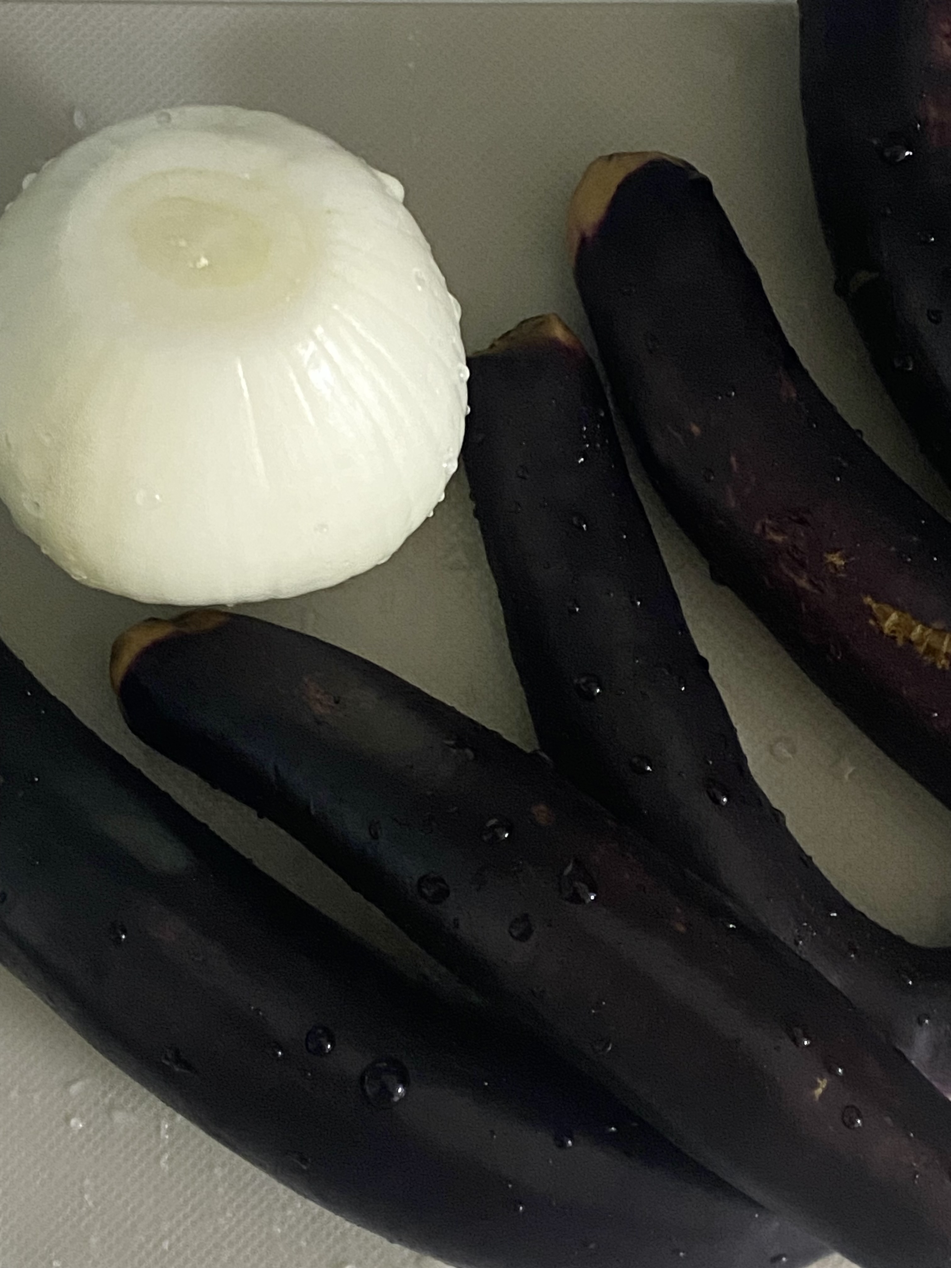 깨끗히 씻은 가지와 양파를 준비합니다.