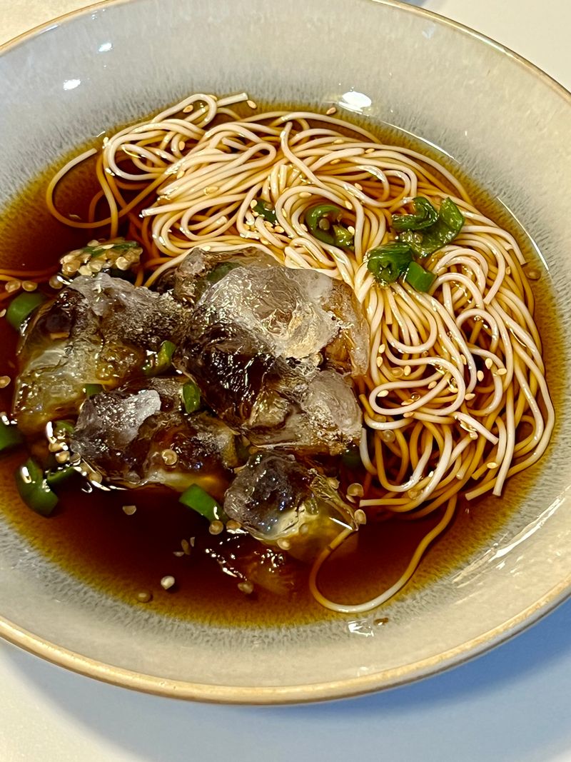 8. 그릇에 얼음을 넣고 소면을 담은 후 물을 부어주세요.