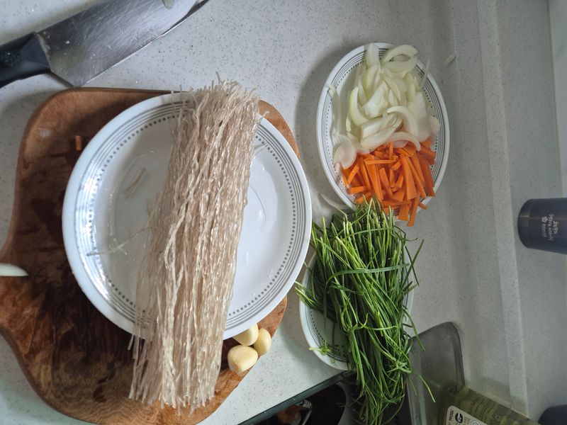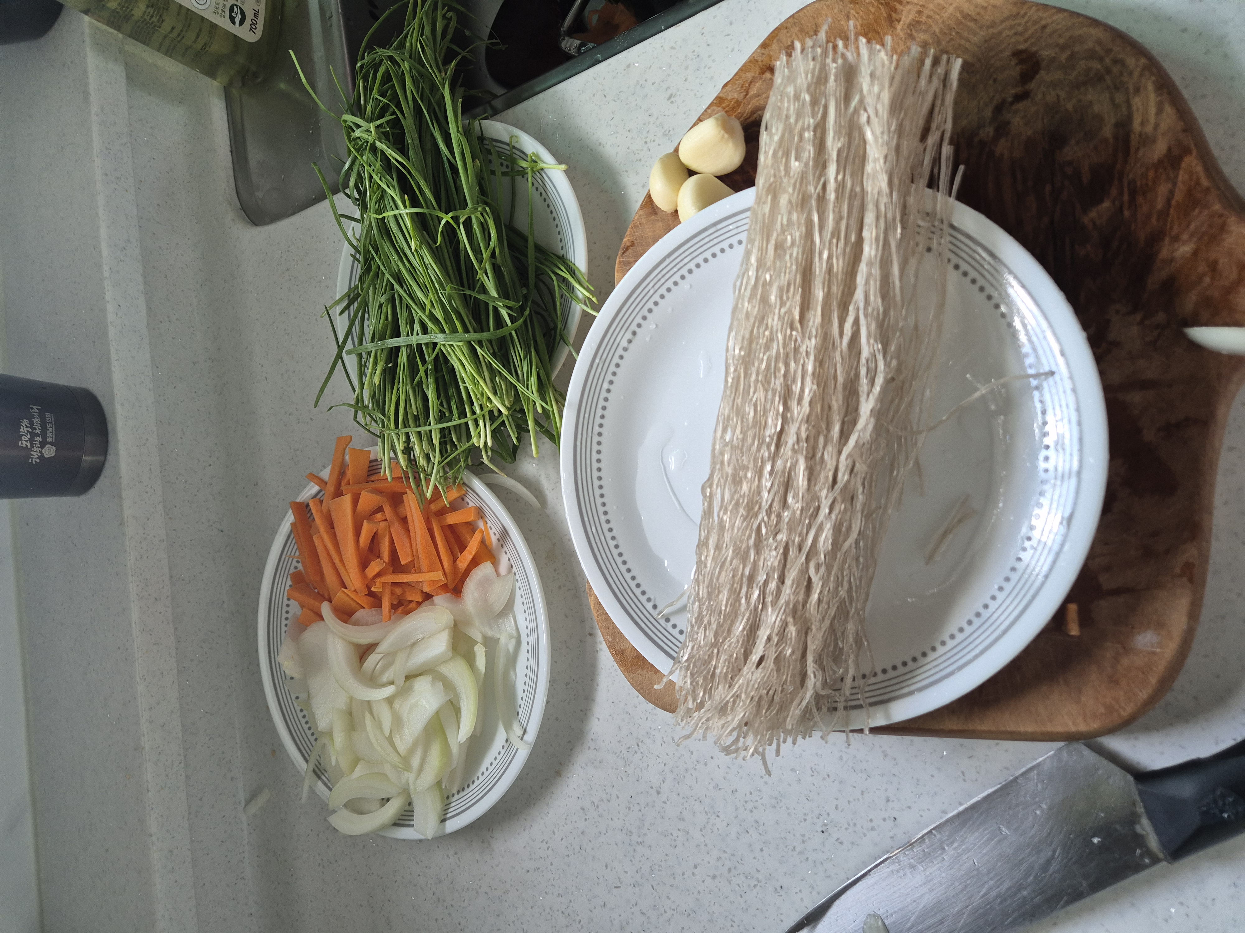 당면과 함께 당근, 양파, 부추도 다 넣어서 완성했습니다.