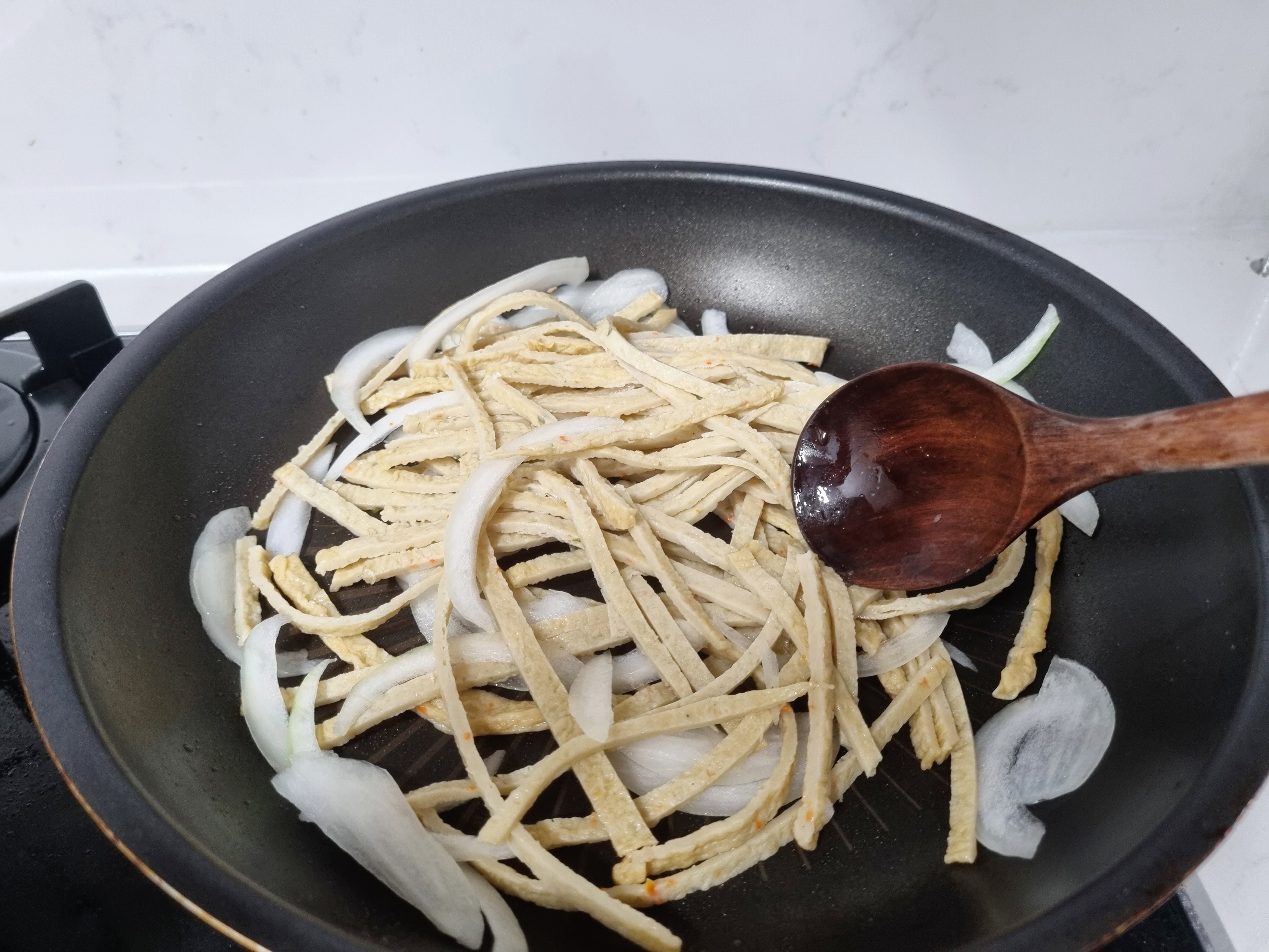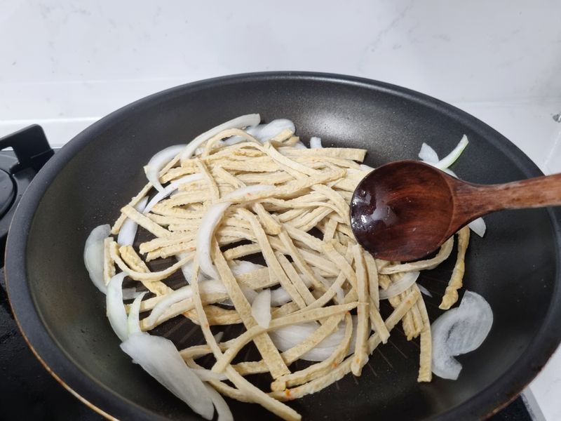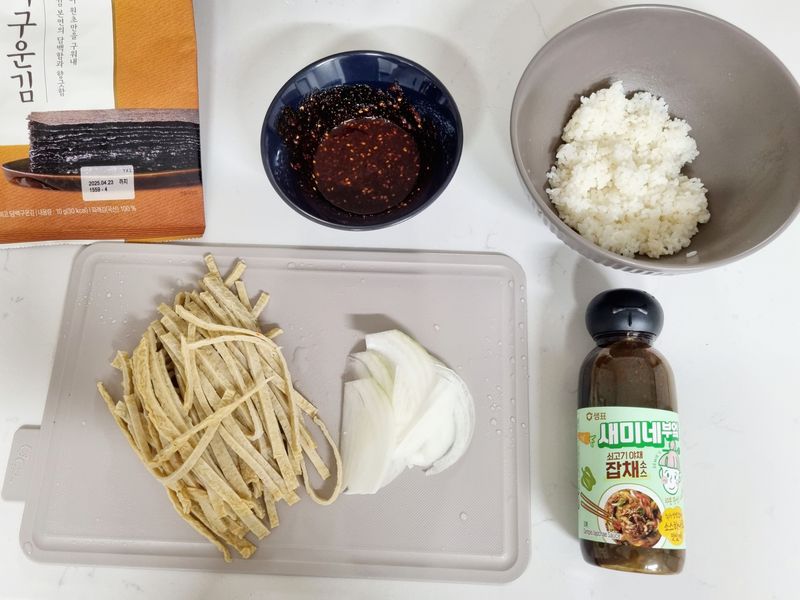 썰어둔 양파와 어묵을 볶기 전에 쇠고기야채잡채소스를